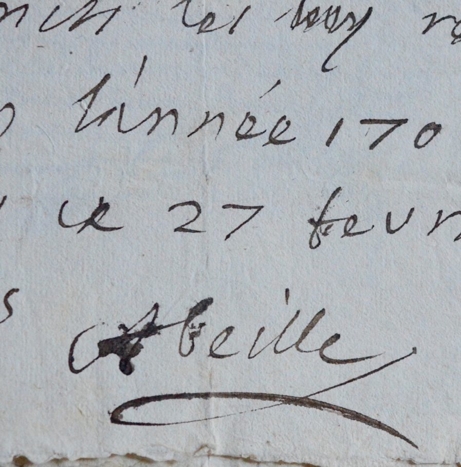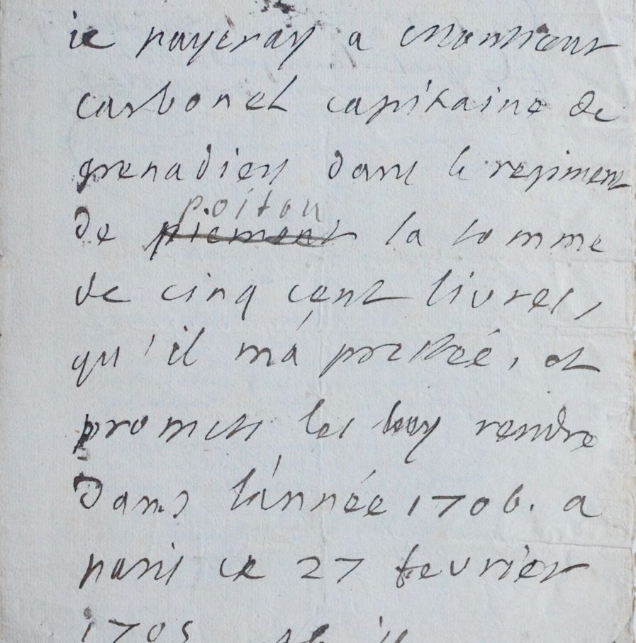 "Je payeray a Monsieur Carbonel capitaine de grenadiers dans le régiment de poitou ['piémont' biffé] la somme de cinq cent livre, qu'il m'a prêtée, et promets les luy rendre dans l'année 1706 [...]".