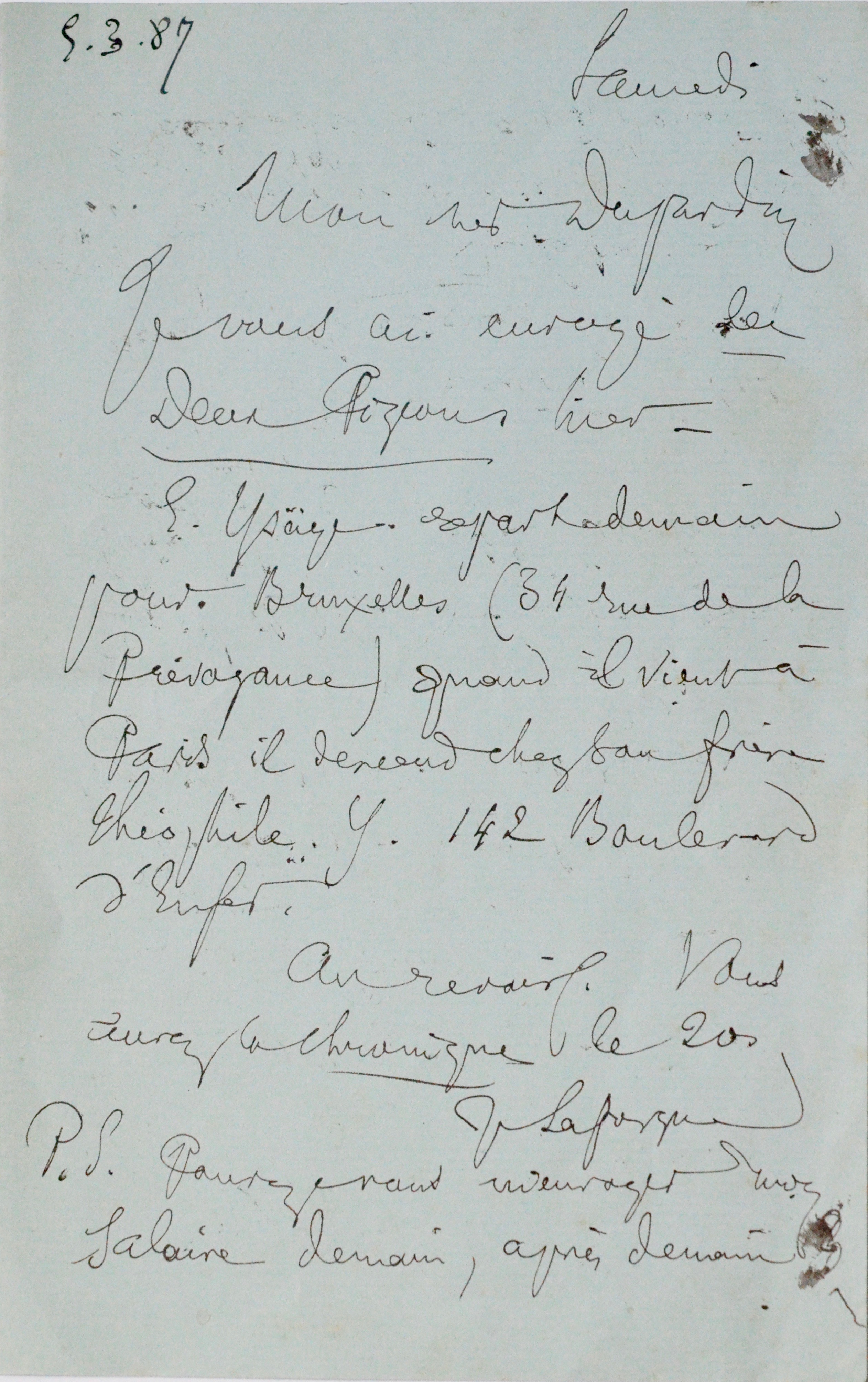 "[...] Je vous ai envoyé Les Deux Pigeons hier. E. Ysaÿe repart demain pour Bruxelles (34 rue de la Prévoyance) quand il vient à Paris il descend chez son frère Théophile Y. 142 boulevard d'Enfer. Au revoir. Vous aurez la Chronique le 20 [...]. P.S. Pouvez-vous m'envoyer mon salaire demain, après demain ?".