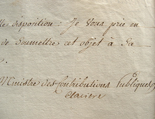 Etienne Clavière (Genève, 1735/1793)Lettre du ministre des contributions directes, Etienne Clavière, proposant les mêmes droits douaniers pour les toiles passant par le bureau d'Armantières que pour les bureaux voisins. «Les toiles de chanvre ou de lin blanches ou écrues, qui viennent de l'étranger, sont sujettes au droit de 70# du quintal ; il n'est cependant que de 36# pour celles écrues et de 45# pour celles blanches lorsqu'elles sont introduites par les bureaux de Lille, Valenciennes, Givet, La Chapelle et Saint-Louis. Le bureau d'Armentières, qui est également voisin des toileries les plus importantes, paraitrait devoir participer à cette exception, et il en résulterait la cessation des difficultés qui s'y élèvent à cet égard, et d'une fraude préjudiciable à la perception du droit et à l'industrie nationale». Il demande à ce que la Convention nationale accorde les mêmes droits à ce bureau. Le document est apostillé par le conventionnel Jacques Alexis Thuriot (1753/1829), qui renvoie la décision au comité de Commerce et de Finances.