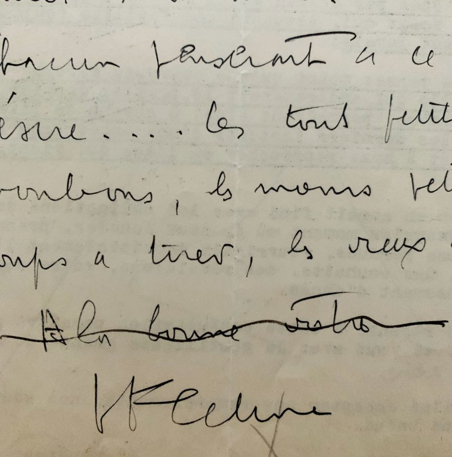 Céline répond : "J'aime bien le bout de l'année parce que les nuits sont longues. Je veux bien qu'on en remette encore au bout. Se la souhaiter bonne et heureuse. Ça veut pas dire grand chose. Faudrait plutôt se demander : combien? Chacun penserait à ce qu'il désire... Les tout petits aux bonbons, les moins petits aux coups à tirer, les vieux aux années. LF Céline".