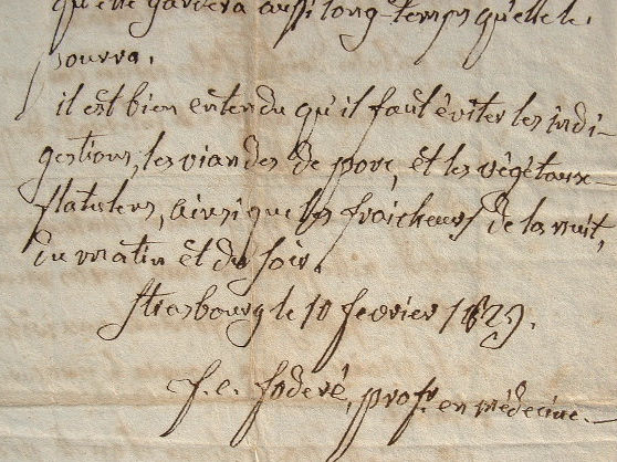 Longue consultation médicale du docteur Fodéré qui diagnostique une congestion intestinale survenue à la suite "d'une dispée ou d'un asthme constitutionnel, compliqué presque toujours de spasmes dans les viscères abdominaux et quelques fois de fièvre d'accès [...]". Il indique en traitement en 4 phases : des pilules dont il indique la composition, puis "2° que dans les grandes chaleurs de l'été, la malade aille prendre aux sources même les eaux de Bussang en se conformant aux instructions de Le Maire, qu'on pourra se procurer à Remiremont. 3° qu'elle s'applique et qu'elle porte jusqu'à ce qu'il tombe un emplâtre de poix de Bourgogne entre les épaules, de la dimension de ce carré de papier. 4° enfin que chaque deux jours, lorsqu'elle est constipée, elle prenne un lavement composé de décoction de mauve, de pissenlit et de camomille vulgaire [...]. Il est bien entendu qu'il faut éviter les indigestions, les viandes de porc et les végétaux flatulents, ainsi que les fraîcheurs de la nuit, du matin et du soir".