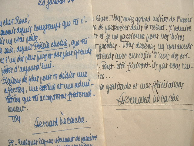 Dans ces deux lettres, Bernard Lecache rend hommage au talent de poète de son ami René Laporte. «Je savais depuis longtemps que tu étais un vrai poète. Je sais, depuis Poésie choisie, que tu es l'un des plus purs et des plus grands poètes d'aujourd'hui [...]».