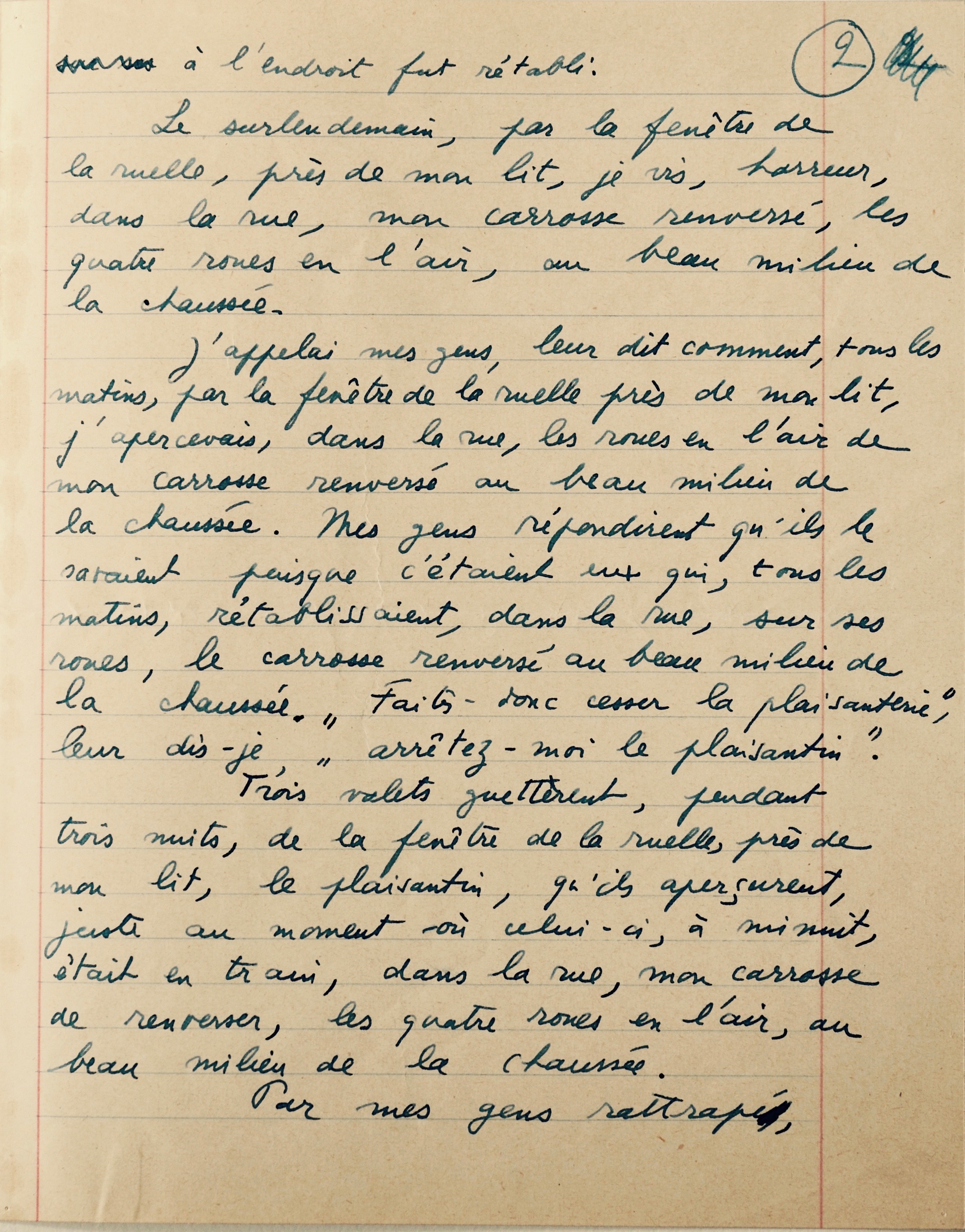 Le lendemain, par la fenêtre de la ruelle, près de mon lit, je vis, horreur, dans la rue, les roues en l’air de mon carrosse renversé au beau milieu de la chaussée. Mon carrosse, sur ses roues, à l'endroit fut rétabli.