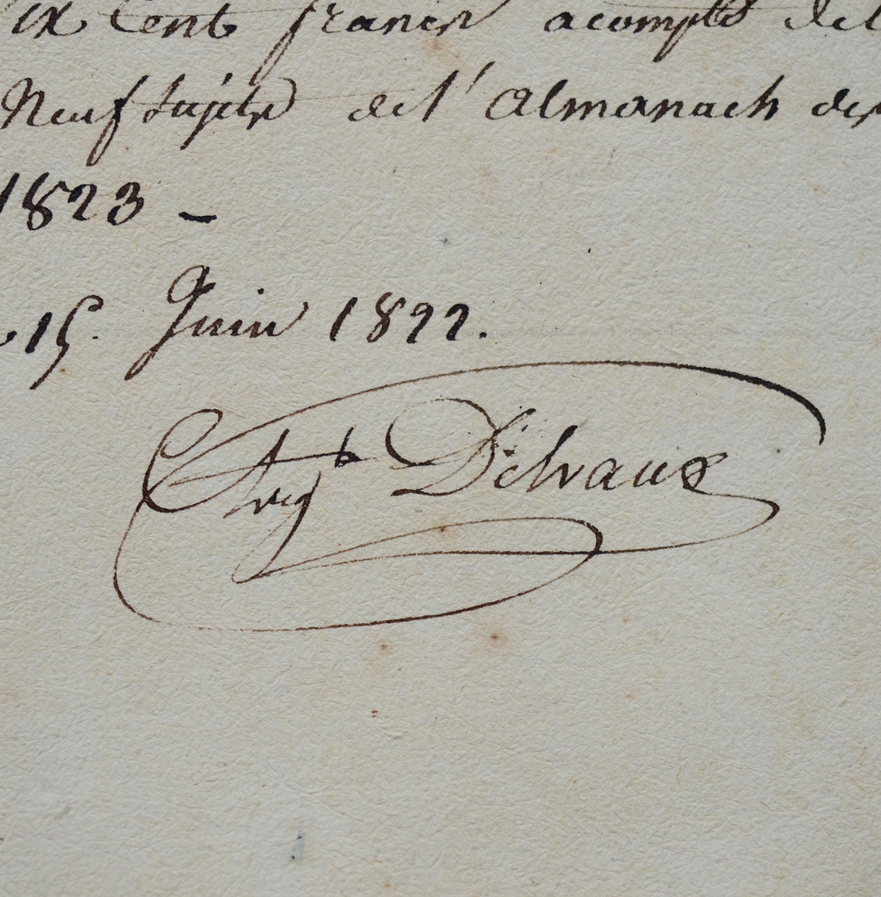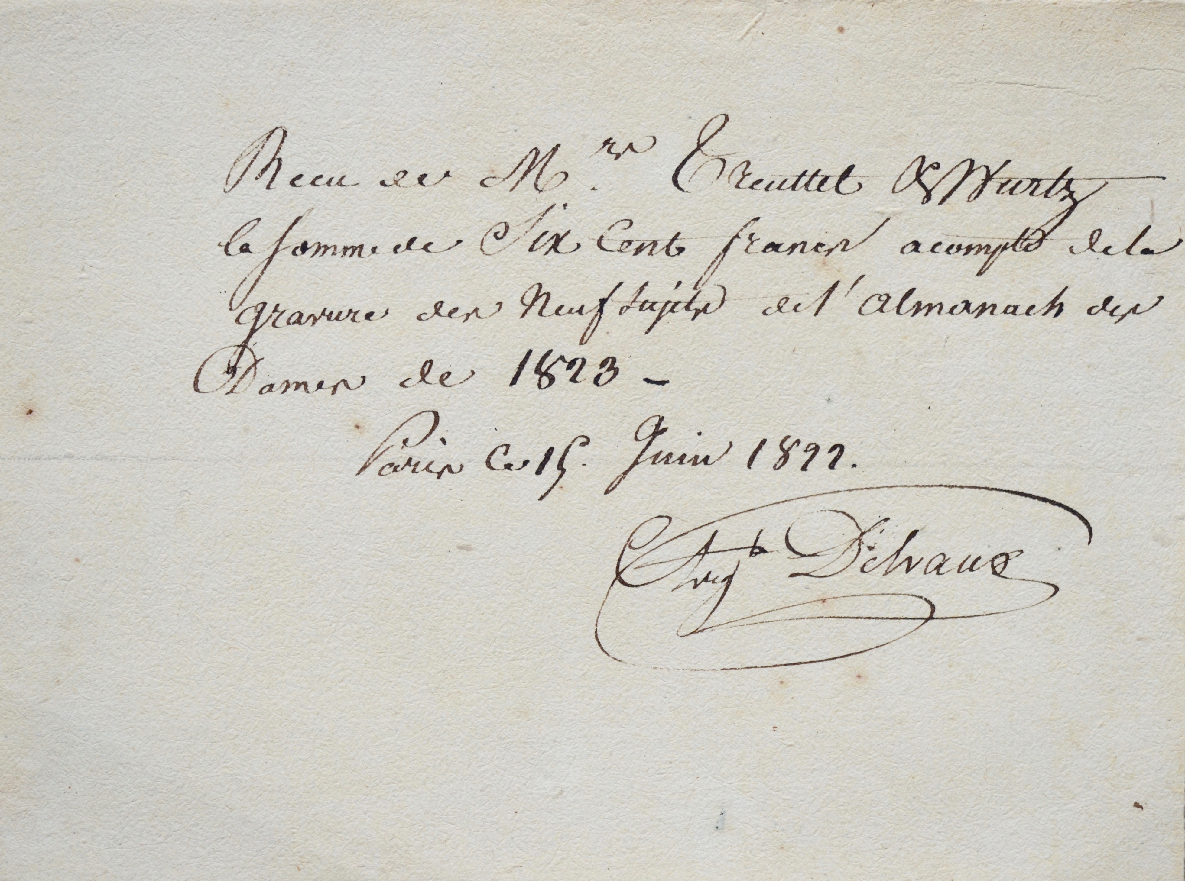 "Reçu de Mrs Treuttel & Wurtz la somme de six cent francs acompte de la gravure des neuf sujets de l'Almanach des Dames de 1823."