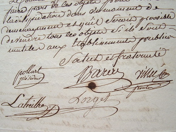 Lettre signée conjointement par les 5 membres du Comité de surveillance d'administration des hôpitaux militaires de Franciade, Barère, Pollart (président), Villée, Latreilhe et Lorget, relative au déménagement des hôpitaux du Grand Secours et du Repentir. Elle est écrite six jours avant la chute de Robespierre. «Nous avons remarqué que l'on a descendu considérablement de boisserie, qu'il existe du bois de charpente, des fagots, et autres objets qui doivent appartenir à la nation. Le citoyen Quinsec que nous avons mandé à ce sujet, nous a dit que l'on avoit déjà fait transporter une petite partie de boisserie à la ci-devant abbaye, que le reste étoit descendu pour faire dans les appartements des réparations ; il nous a ajouté que quand il avoit pris lesdits hôpitaux, il n'avoit été fait aucun état des lieux. Le comité a pensé qu'il devoit vous faire part de ces objets pour éviter la dilapidation dans un moment de déménagement, et qu'il seroit possible de vendre tous les objets si ils sont inutiles aux établissements publics». Une mention indique qu'ordre est donné au citoyen Besche de dresser l'état du mobilier appartenant à la nation, dans les hôpitaux évacués.