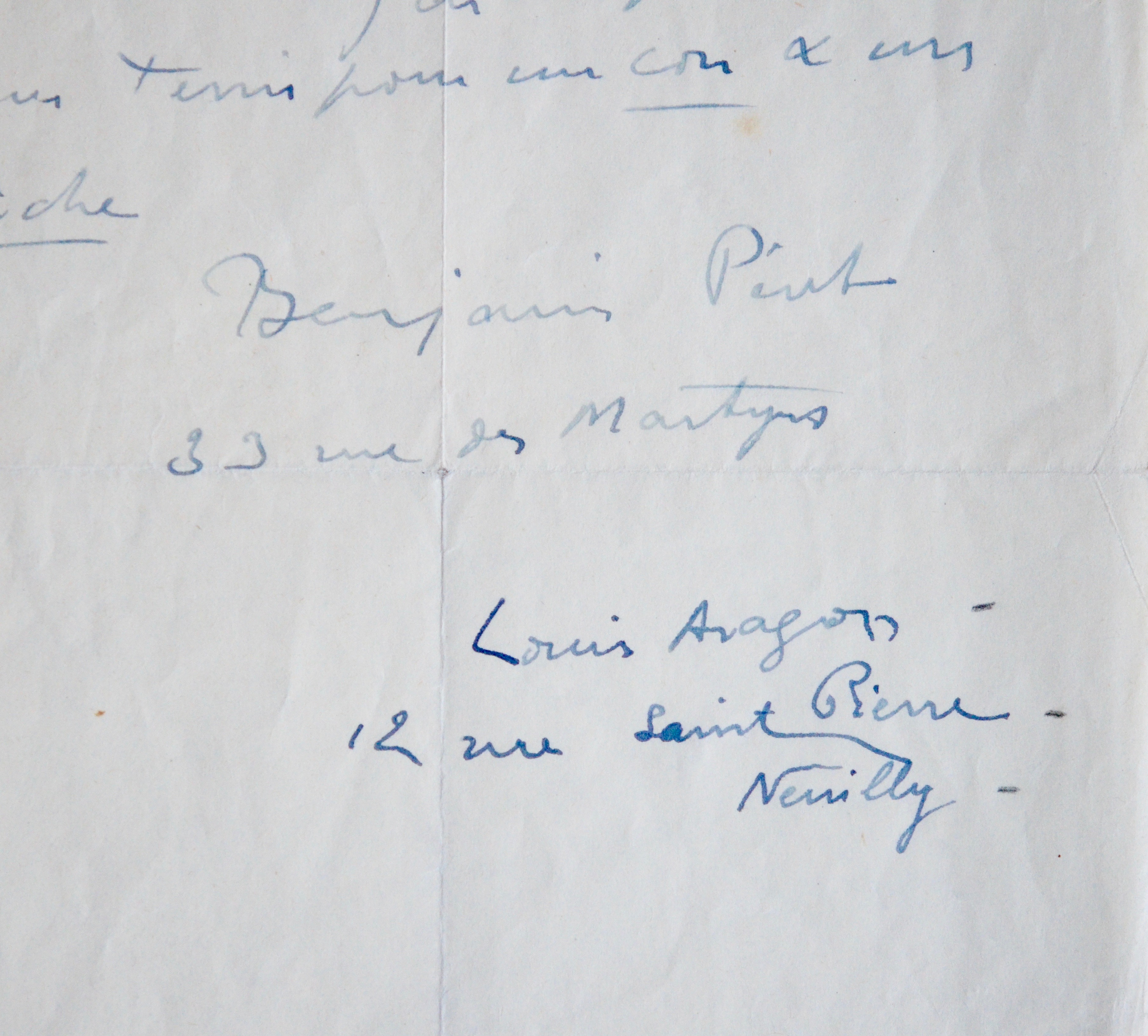 Très amusante lettre d'insultes, rédigée et signée de la main Benjamin Péret et contresignée par Louis Aragon.