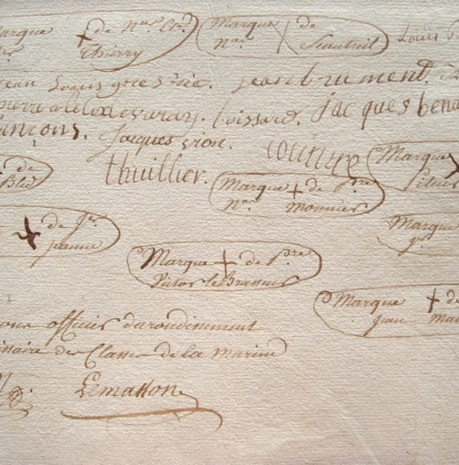 Pièce manuscrite signée par 21 officiers mariniers et matelots de Fécamp, dont 9 ont signé d'une croix (identifiés). Il s'agit du procès verbal de l'élection de leur représentant pour la fête de la Fédération qui doit se tenir le 14 juillet 1790 à Paris, et qui sera la plus grande fête de la Révolution. Ils ont choisi le quartier maître Nicolas Et. J. Thierry : «nous l'avons député pour être rendu à Paris le 12 juillet prochain [...] ; nous l'avons en outre chargé de prêter lui seul pour nous tous le serment qui sera requis lors de ladite fédération générale qui doit avoir lieu à Paris le 14 du mois prochain [...]».