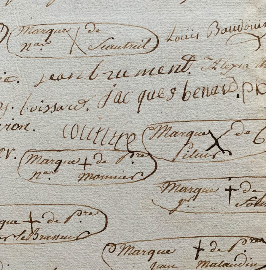 Pièce manuscrite signée par 21 mariniers et matelots de Fécamp, dont 9 ont signé d'une croix (identifiés en dessous).