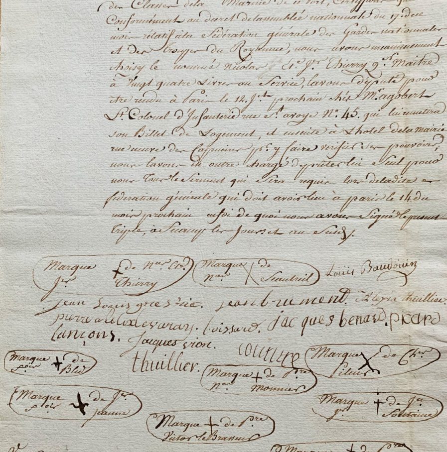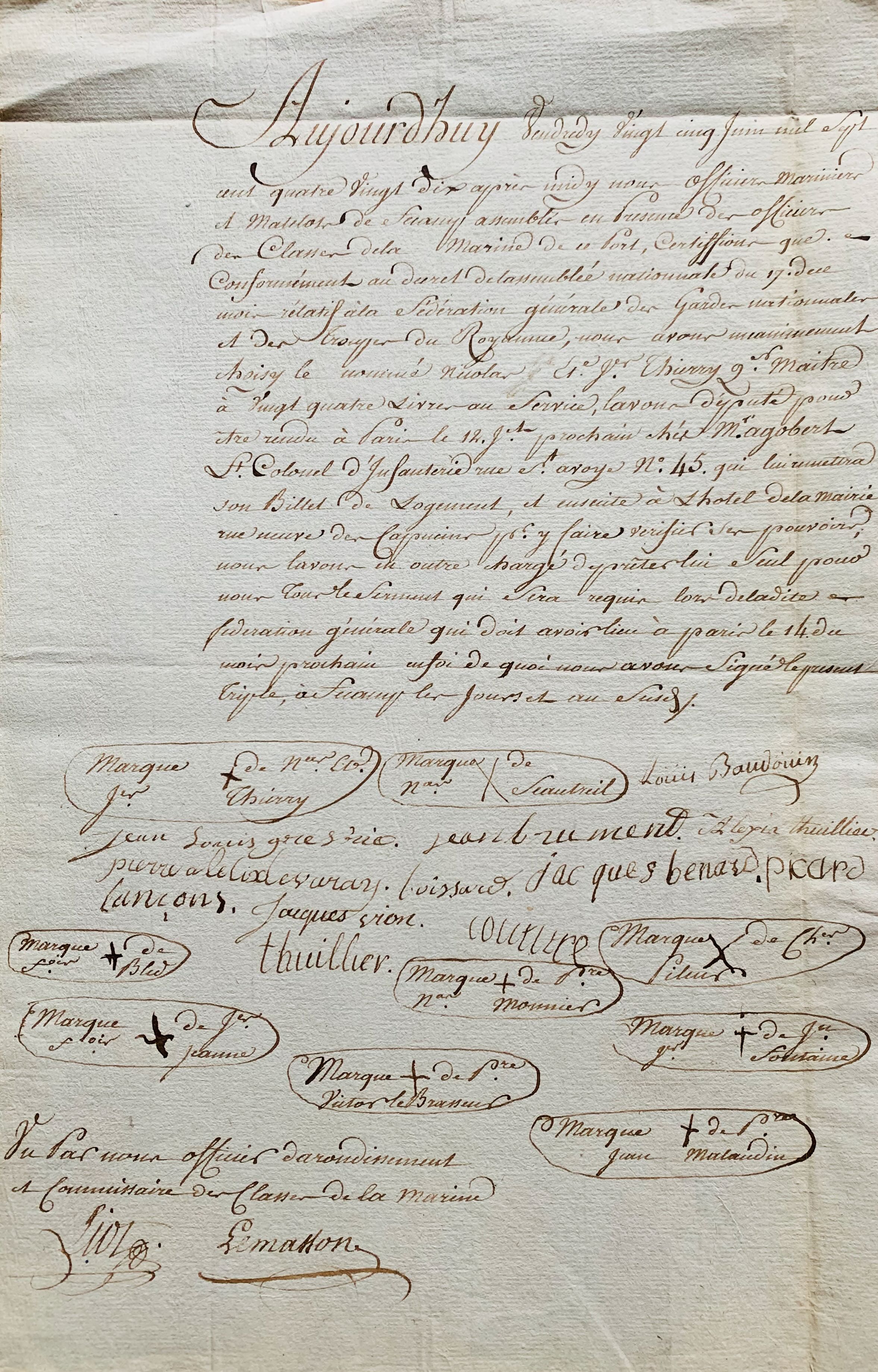 Il s'agit du procès verbal de l'élection de leur représentant pour la fête de la Fédération qui doit se tenir le 14 juillet 1790 à Paris, et qui sera la plus grande fête de la Révolution. Ils ont choisi le quartier maître Nicolas Et. J. Thierry : « nous l'avons député pour être rendu à Paris le 12 juillet prochain [...] ; nous l'avons en outre chargé de prêter lui seul pour nous tous le serment qui sera requis lors de ladite fédération générale qui doit avoir lieu à Paris le 14 du mois prochain [...] ».