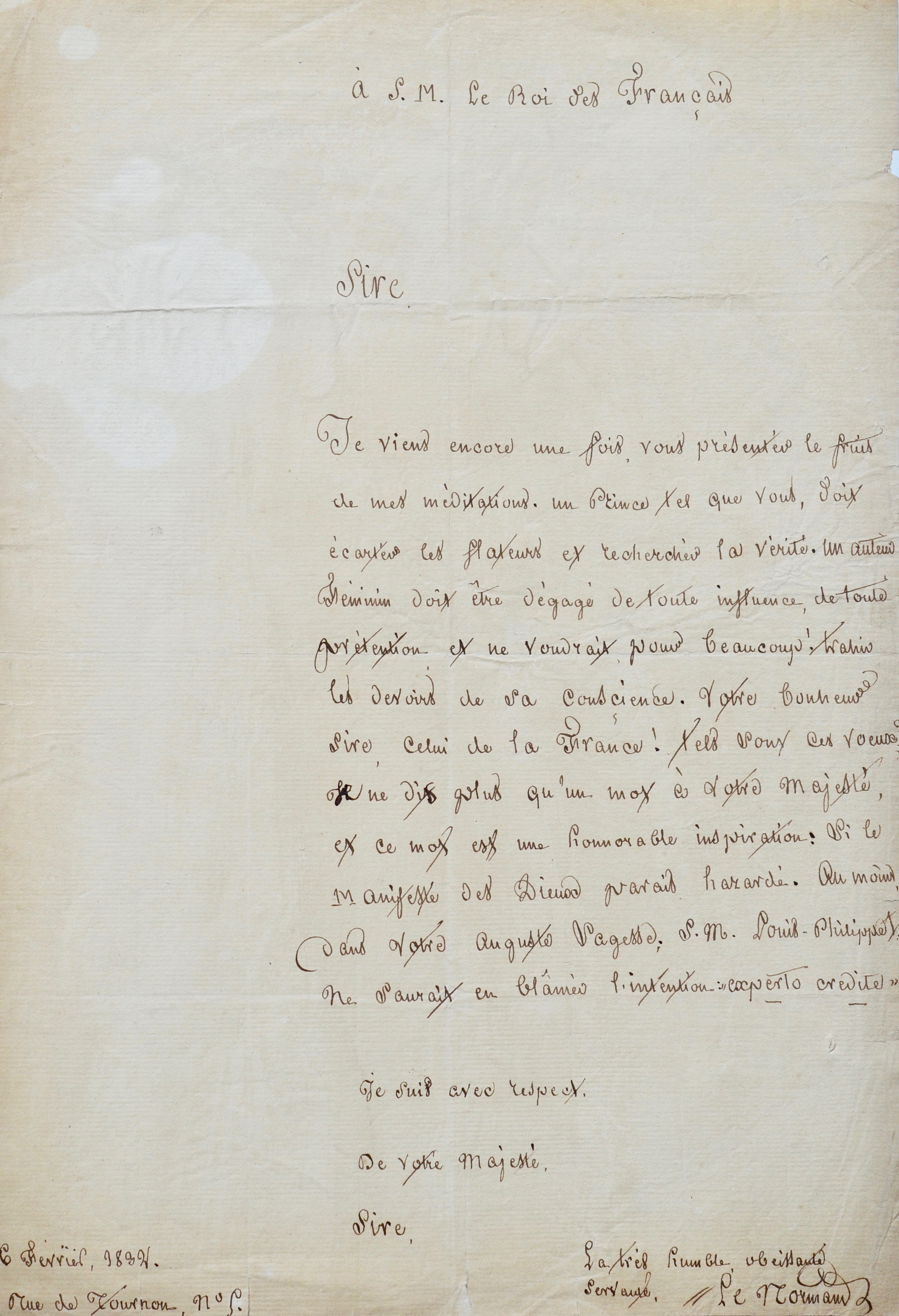 Marie-Anne Adélaïde Lenormand (Alençon, 1772/1843)Étonnante lettre de la célèbre voyante Marie-Anne Adélaïde Lenormand au roi Louis-Philippe. "Sire, Je viens encore une fois vous présenter le fruit de mes médiatations. Un Prince tel que vous, doit écarter les flatteurs et rechercher la vérité. Un auteur féminin doit être dégagé de toute influence, de toute prétention et ne voudrait pour beaucoup trahir les devoirs de sa conscience. Votre bonheur, Sire, celui de la France! Tels sont ces voeux. Je ne dis plus qu'un mot à votre majesté, et ce mot est une honorable inspiration : si le manifeste des Dieux parait hasardé, au moins dans votre auguste sagesse, S.M. Louis-Philippe ne saurait en blâmer l'intention : "experto credite" [...]".
