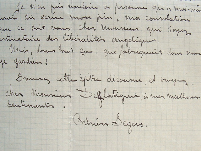 Adrien Segers (1876/1951)Le peintre des paysages rouennais, Adrien Segers, raconte ses mésaventures survenues à l'exposition des artistes rouennais, pour la vente de sa grande marine. «Lorsque le maître Anatole France écrivit la Révolte des anges, il est une situation qu'il n'a pas prévue ou qu'il a négligé de décrire, celle de votre serviteur et de plusieurs de ses contemporains. L'étrangeté des aventures qui m'arrivent aux expositions rouennaises est vraiment stupéfiante [...]. La première aventure date de l'ouverture de l'exposition des artistes rouennais. Dès les premiers jours, un de mes confrères vint m'annoncer la vente de ma grande toile. Vous vous souvenez qu'une erreur s'était produite à mon désavantage. Or, seconde aventure. J'expose chez "Deca", je commets la faute de donner mon prix de vive voix à un débutant dans la partie, etc. Je reçois dès le premier jour encore la visite du même confrère et ami en me disant dans les mêmes termes d'ailleurs, que ma marine est vendue. A qui ? A M. D. [Deglatigny]. L'ami en question me dit alors le prix de vente, et devant cette nouvelle erreur, je ne peux m'empêcher de rire. Avouez, cher monsieur, que ce concours de circonstances analogues dans lesquelles se meuvent les mêmes personnages est des plus impressionnants ! Je vous dis : à la troisième, je croirai au diable, à ses pompes et à ses oeuvres et je m'attacherai à un tarif pour toujours ! [...] Je n'en suis pas tout de même à liquider mes toiles. Je n'en puis vouloir à personne qu'à moi-même. J'aurais dû écrire mon prix. Ma consolation est que ce soit vous, cher monsieur, qui soyez le destinataire des libéralités angéliques. Mais, dans tout çà, que fabriquait mon ange gardien ? [...]».