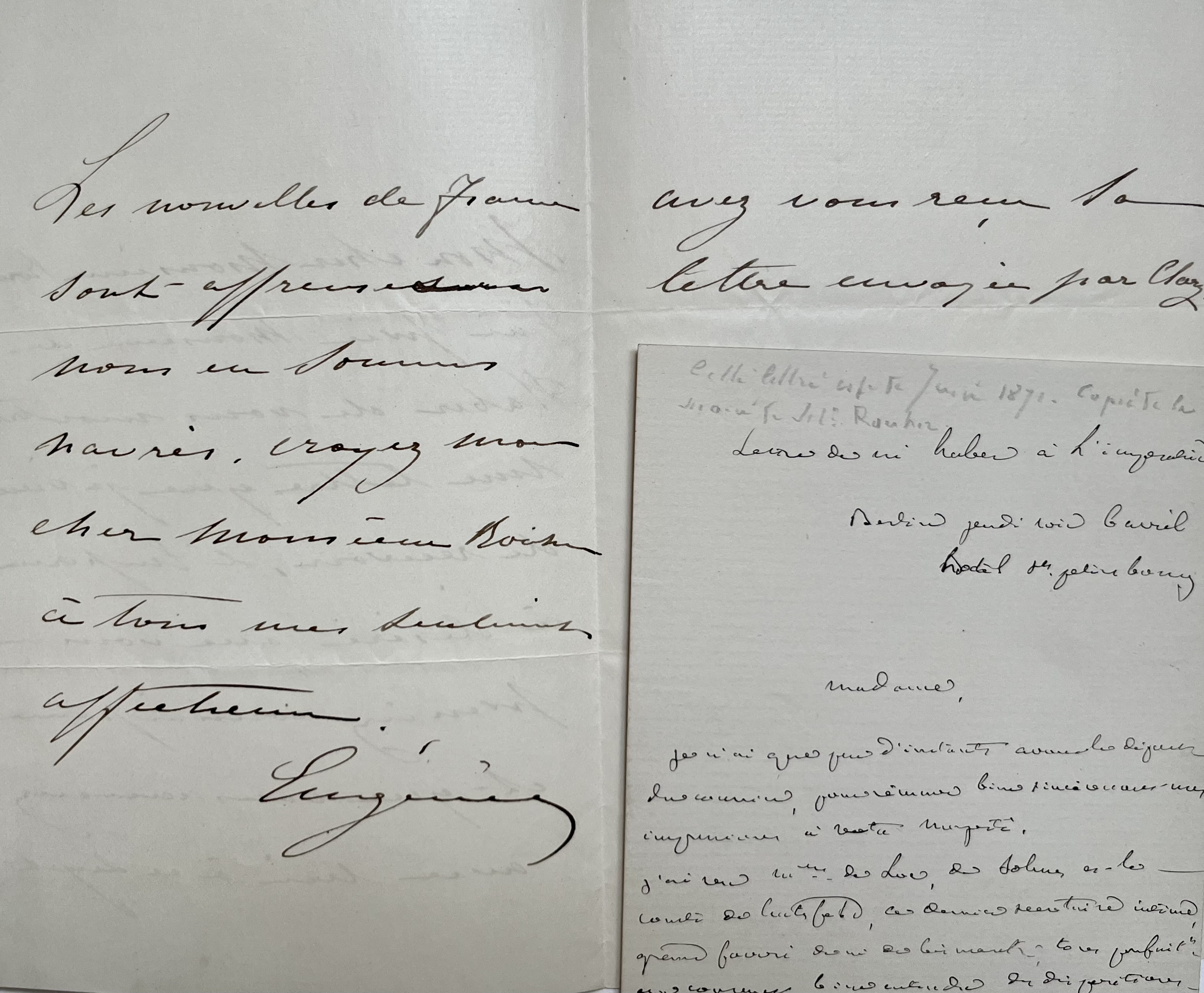 "[...] Les nouvelles de France sont affreuses, nous en sommes navrés [...] Avez-vous reçu la lettre envoyée par Clary".