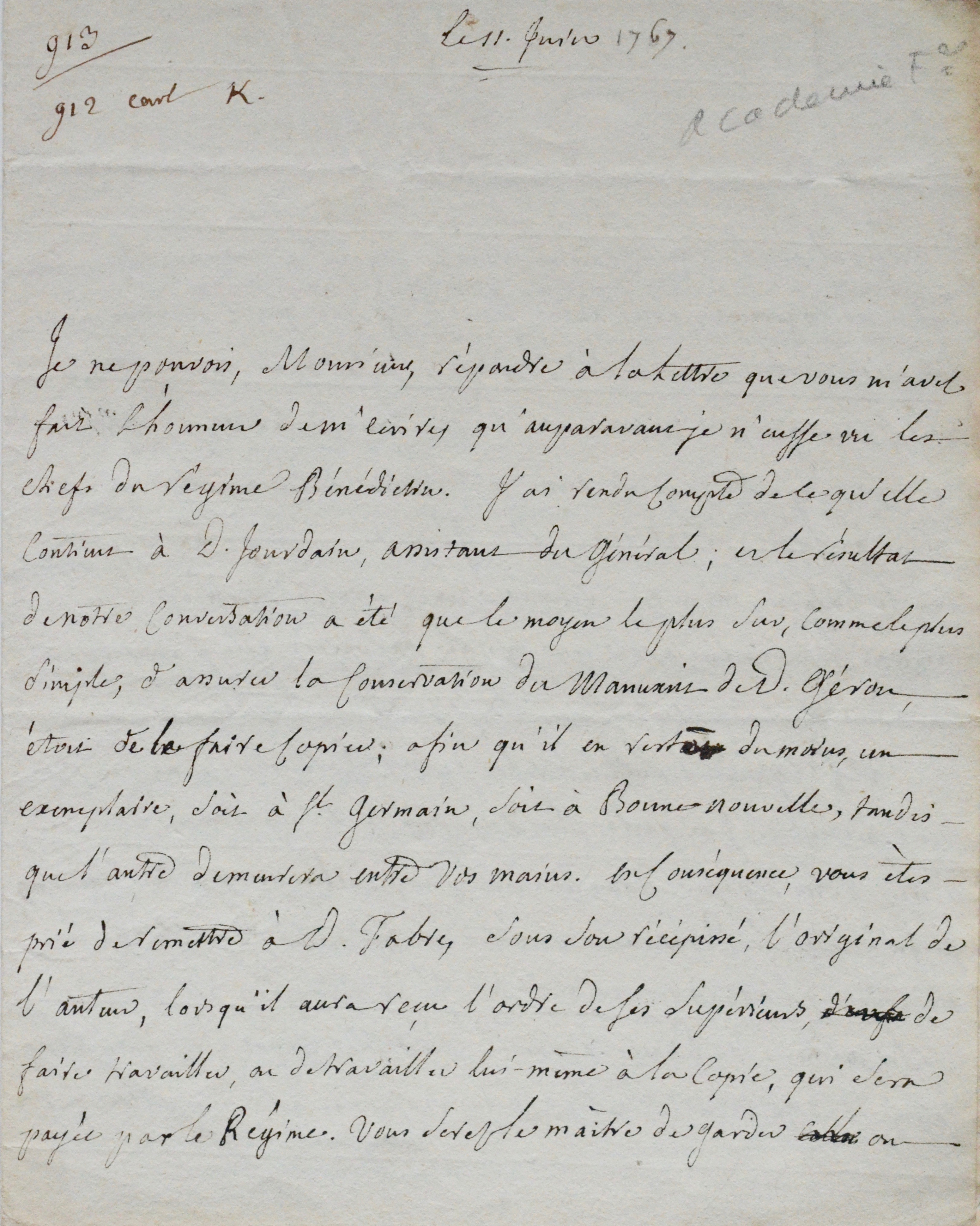 Il a rendu compte du courrier de Jousse à D. Jourdain à propos de la conservation d'un manuscrit de Dom Géron : "et le résultat de notre conversation a été que le moyen le plus sûr, comme le plus simple, d'assurer la conservation du manuscrit de D. Géron étoit de le faire copier ; afin qu'il en reste du moins un exemplaire, soit à St Germain, soit à Bonne Nouvelle, tandis que l'autre demeurera entre vos mains. En conséquence, vous êtes prié de remettre à D. Fabre sous son récépissé, l'original de l'auteur [...]". La copie sera payée par le Régime. Jousse devra décider s'il garde par la suite l'original ou la copie. "Au moyen de cet arrangement, nous avons lieu d'espérer que l'ouvrage ne sera pas perdu pour notre Province. Je sais quelle part vous y avez, ainsi que M. Massuan. Parmi tant de héros, je n'ose me nommer : cependant je puis aussi me rendre le témoignage que j'ai fourni quelques indications à D. Géron. Il y a quelques jours que le hasard m'en fit retrouver une assez singulière, dont je pourrois bien ne lui avoir pas envoyé la copie : elle s'étoit égarée dans un ancien portefeuille [...]".