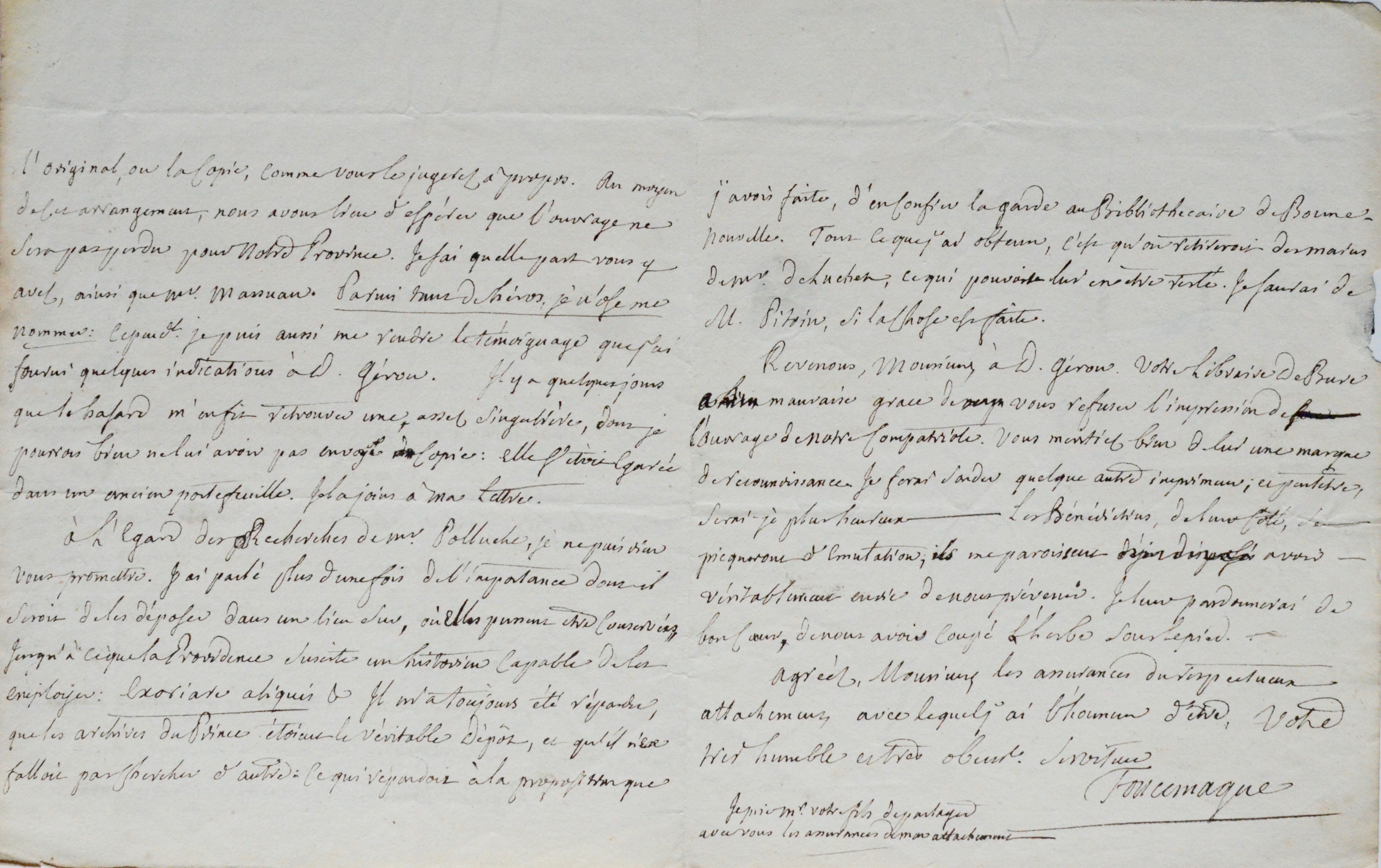 Etienne Foncemagne (Lauréault de) (Orléans, 1694/1779)Passionnant courrier reliant plusieurs érudits orléanais du XVIIIe siècle : l'Académicien Foncemagne, Daniel Jousse, Guillaume Gérou, Daniel Polluche, Dom Fabre, etc.