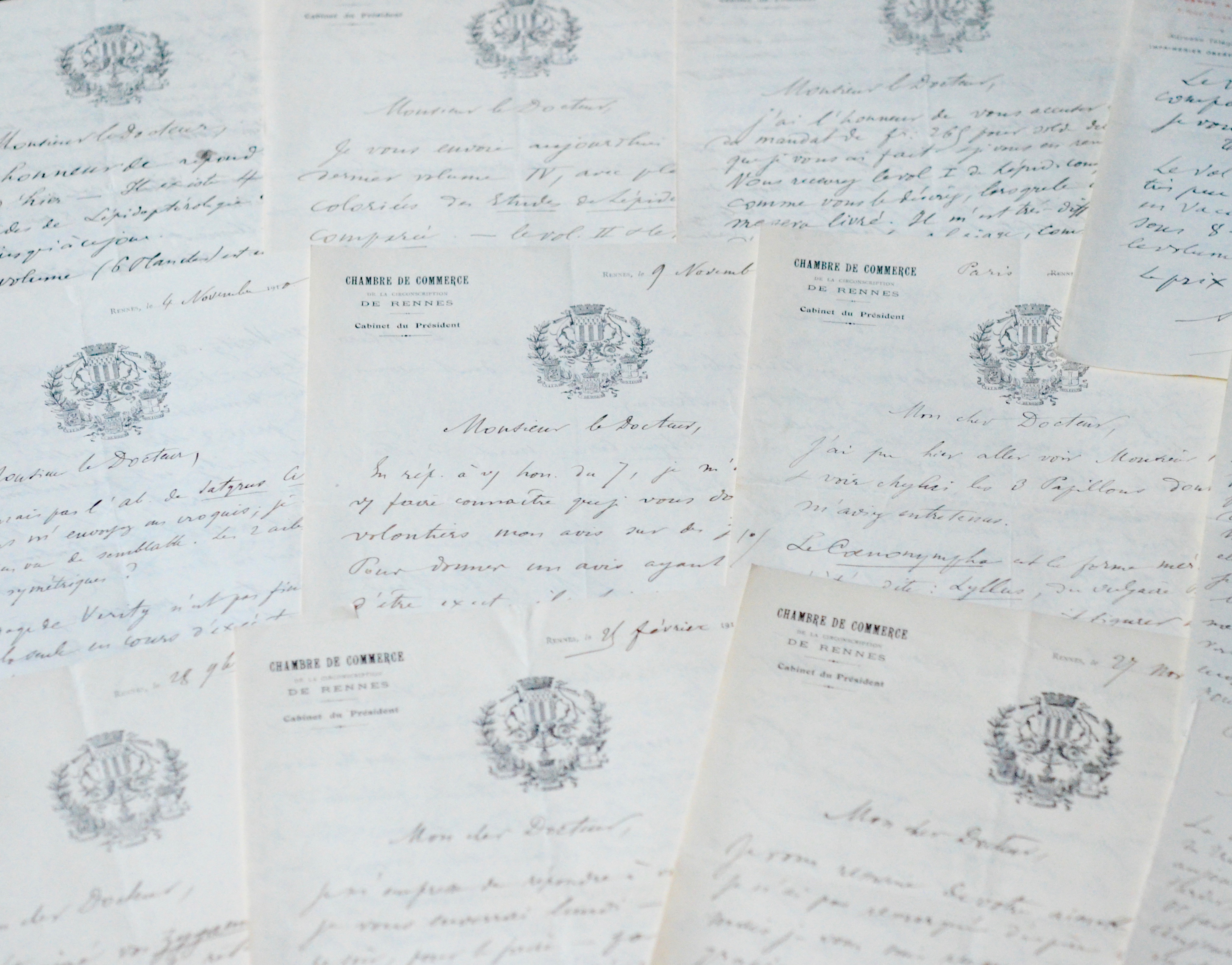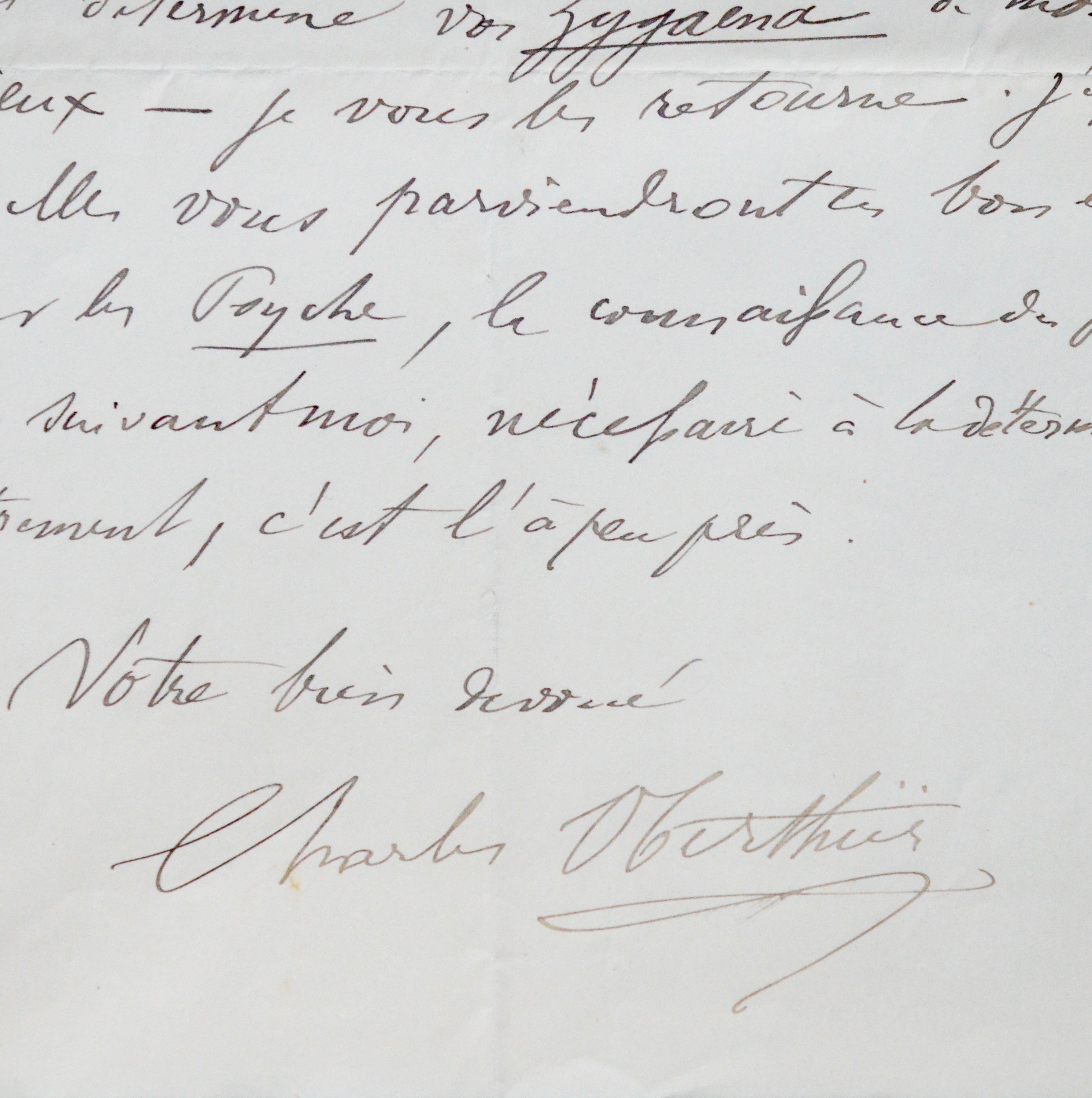 Charles Oberthür (Rennes, 1845/1924)Longue et passionnante correspondance de Charles Oberthür, relative à son ouvrage : Etudes de Lépidoptérologie comparée, à ses impressions et à ses recherches. Féru de papillons, Oberthür nomma de nombreuses espèces, dont certaines se trouvaient dans le Vaucluse, pays de son correspondant.