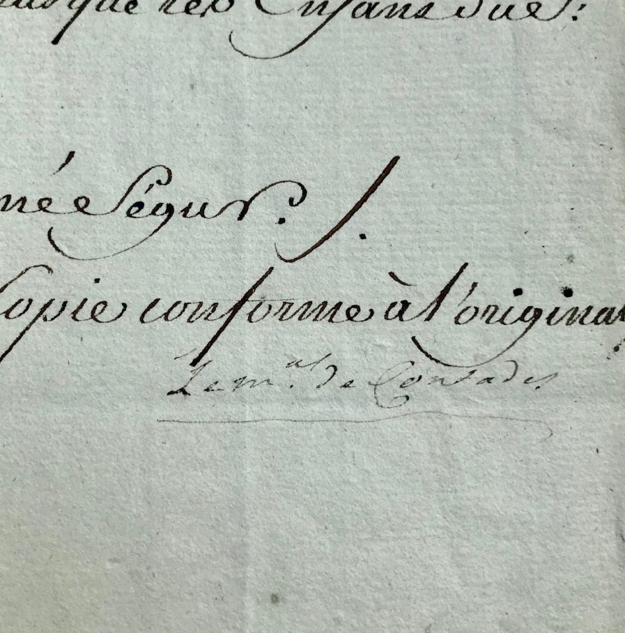 Copie d'une lettre du marquis de Ségur, adressée au Maréchal de Contades, alors commandant en chef d'Alsace et contre-signée par lui pour attester de sa conformité.