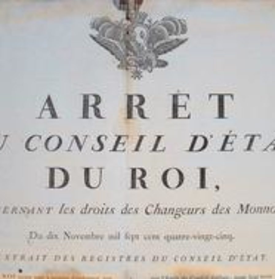 «Arrêt du Conseil d'Etat du roi concernant les droits des changeurs des monnoies», rendu à l'occasion de la fabrication des nouvelles monnaies d'or. Cette affiche précise que désormais «les changeurs ne pourront percevoir sur tous les louis frappés à l'ancienne empreinte, qui leur seront apportés pour être échangés, que la moitié des droits qui leur sont attribués [...]». Une nouvelle valeur est fixée : «A demi-denier pour livre pour ceux qui demeurent dans les villes où il y a Hôtel des Monnoies, à un denier et demi pour ceux qui sont à la distance de dix lieues [...]».