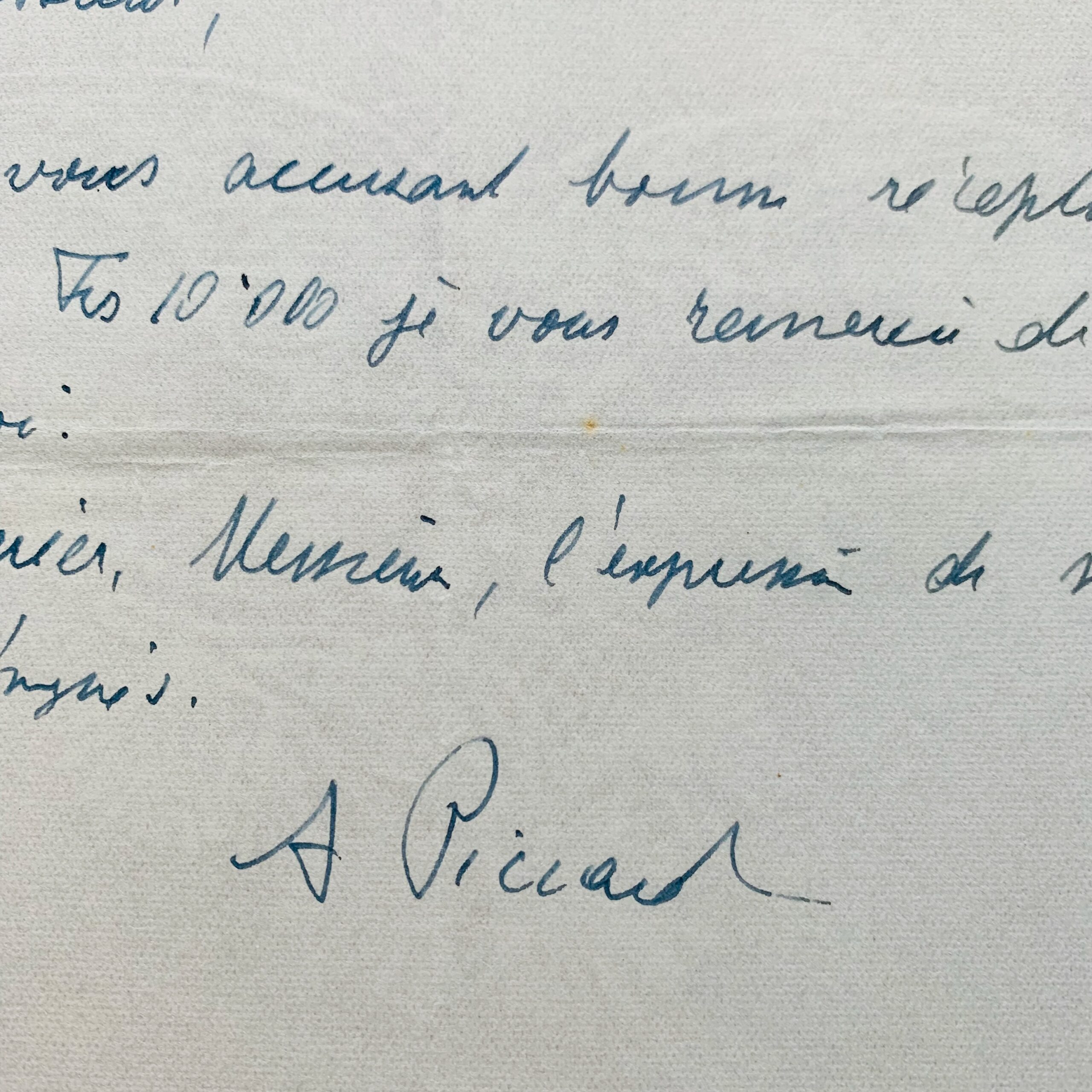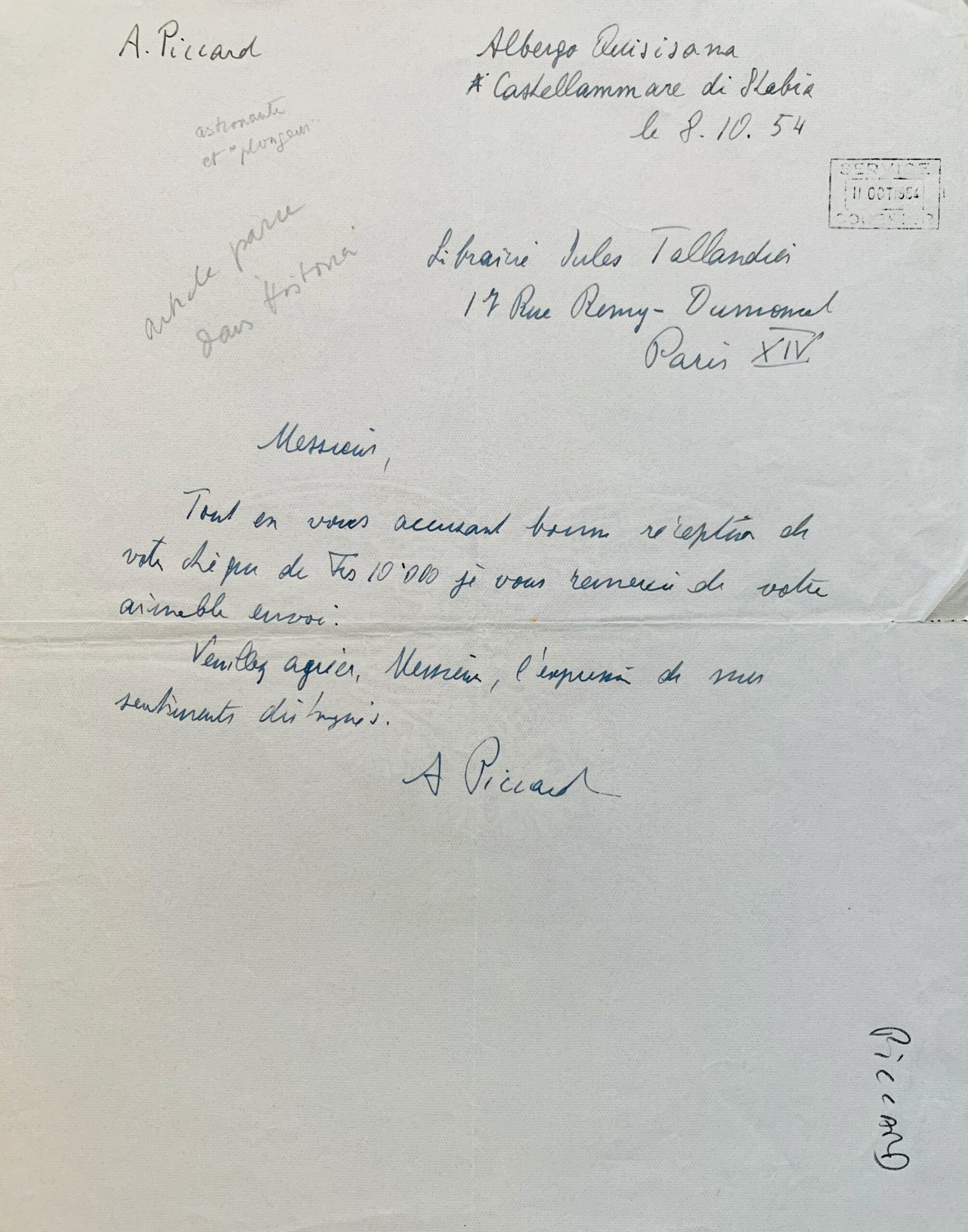 Auguste Piccard accuse réception du chèque de 10.000 francs de la librairie Tallandier en rémunération de l'article paru dans la revue Historia (selon une note au crayon)