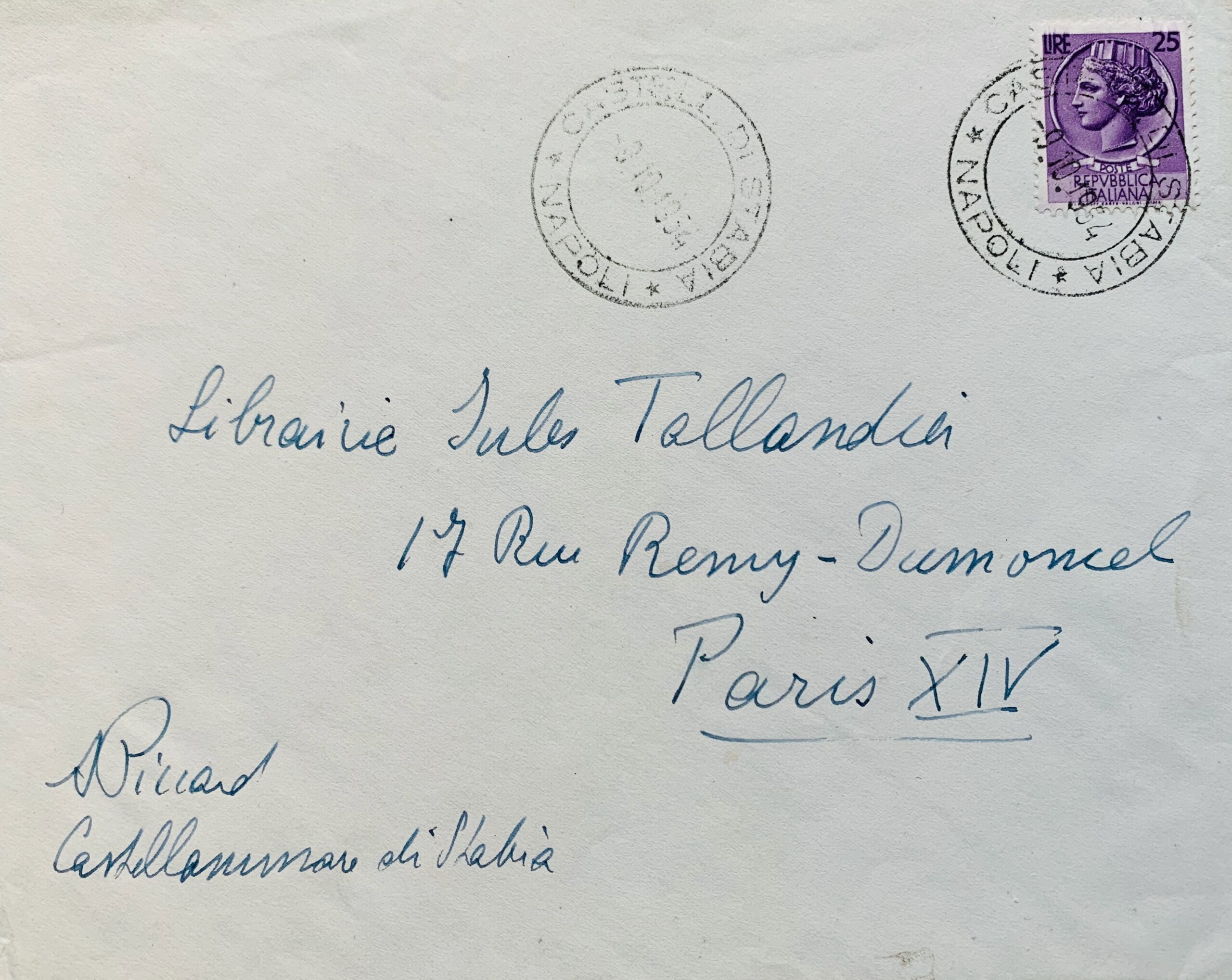 Cachet d'arrivée du courrier (à la date du 11 octobre 1954). Enveloppe autographe timbrée.