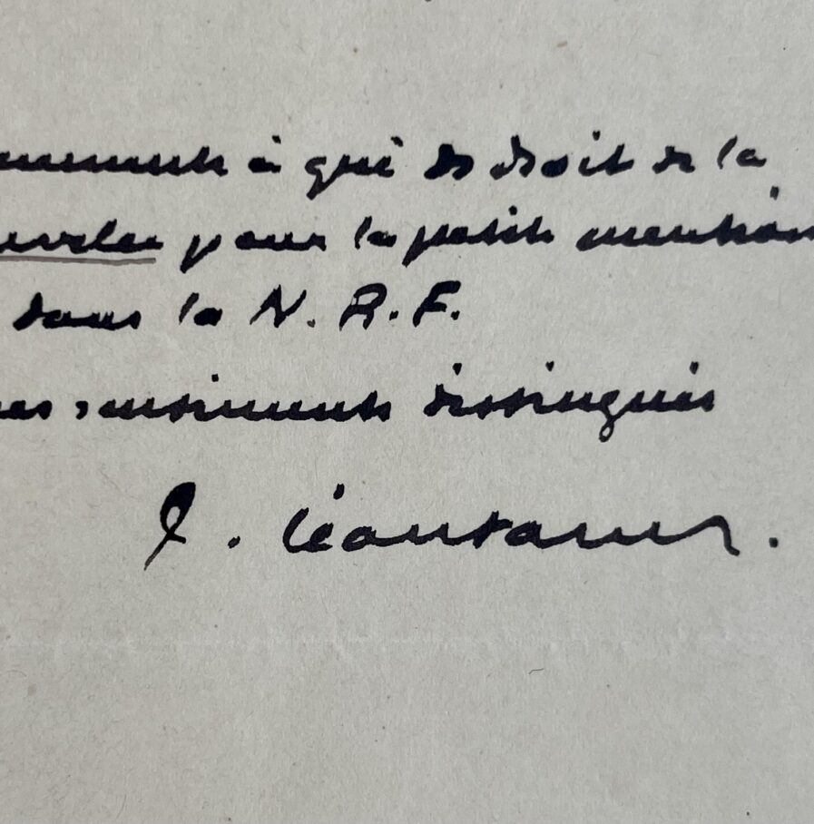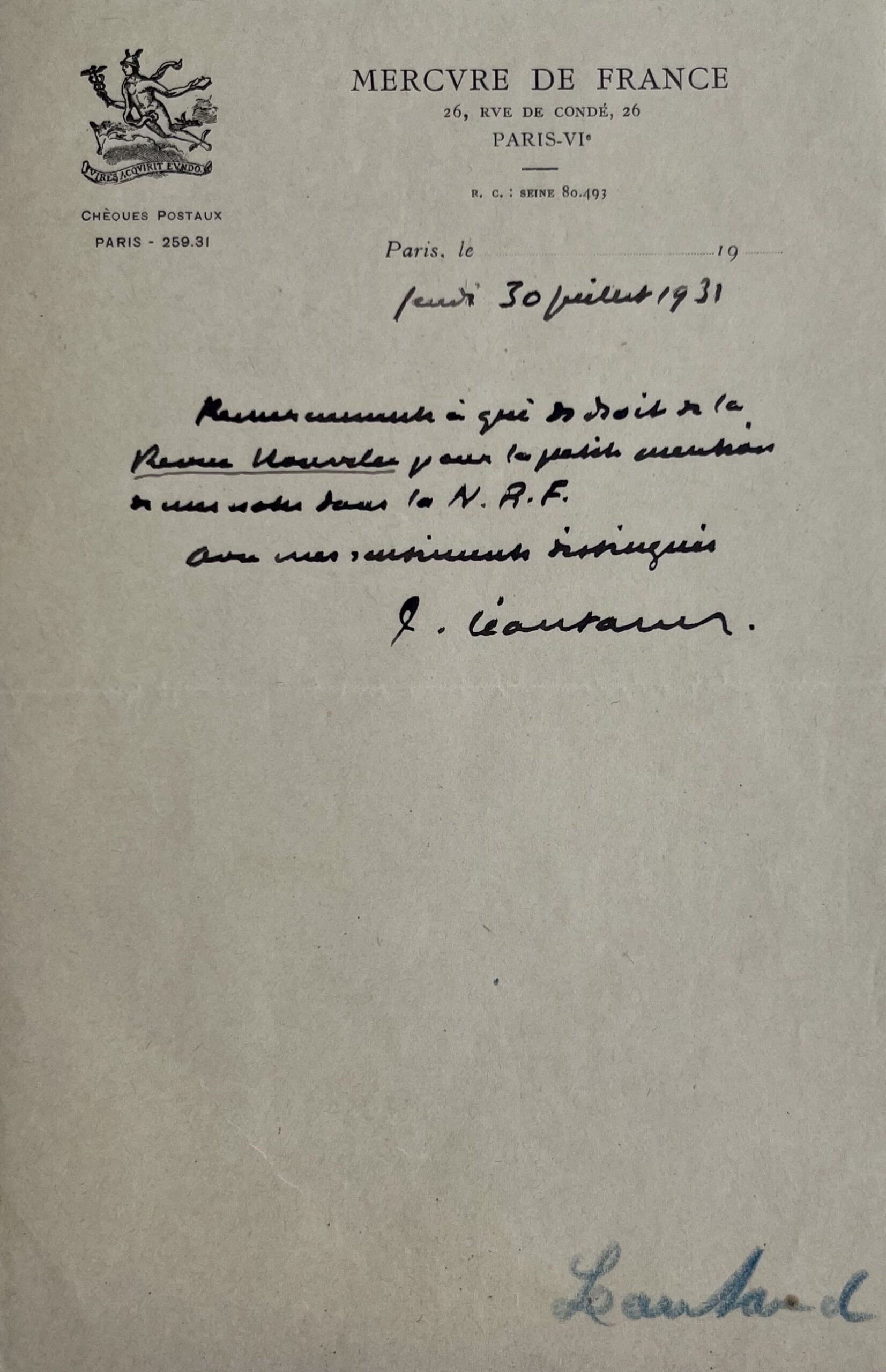 "Remerciements à qui de droit de la Revue Nouvelle pour la petite mention de mes notes dans la N.R.F. Avec mes sentiments distingués. P. Léautaud".
