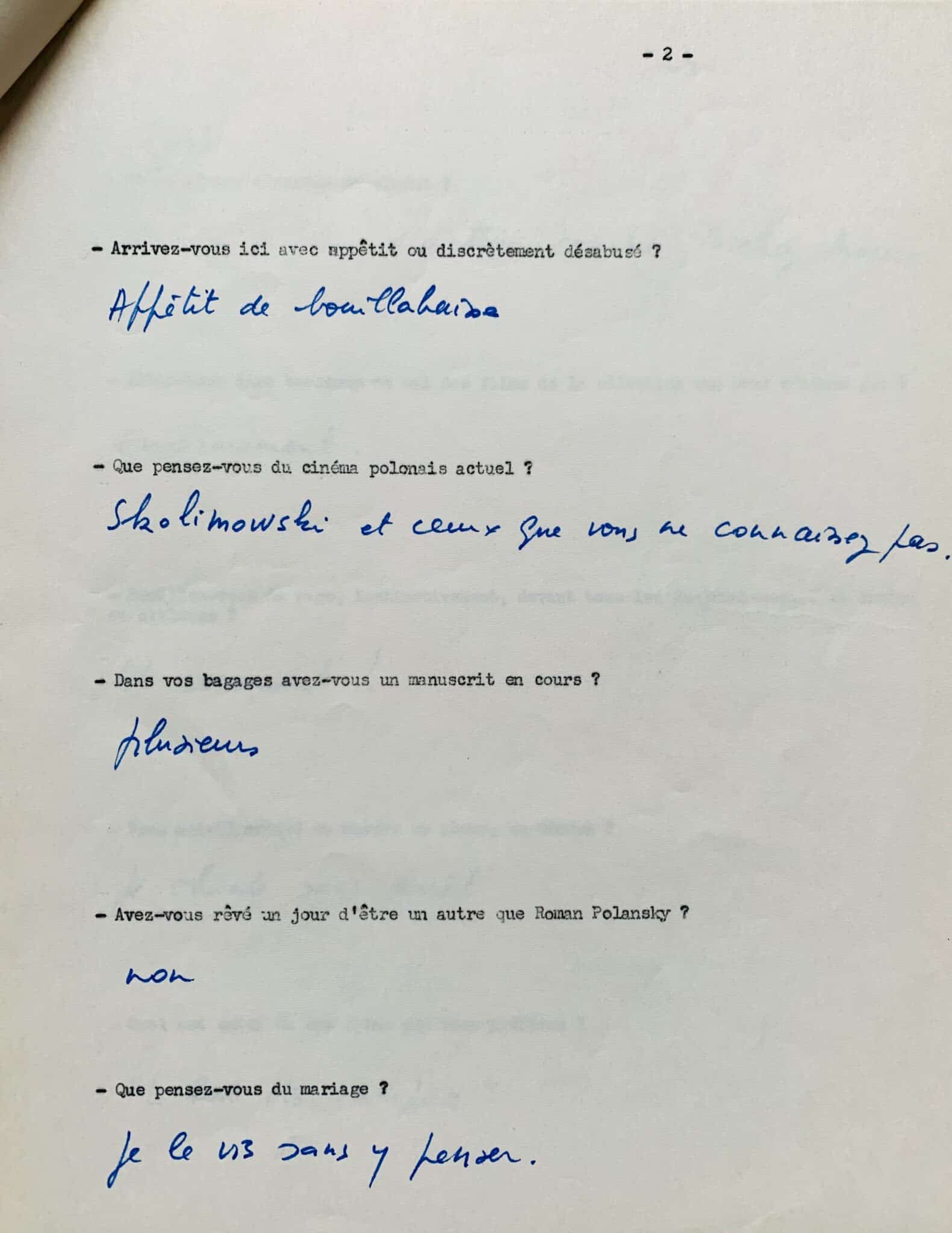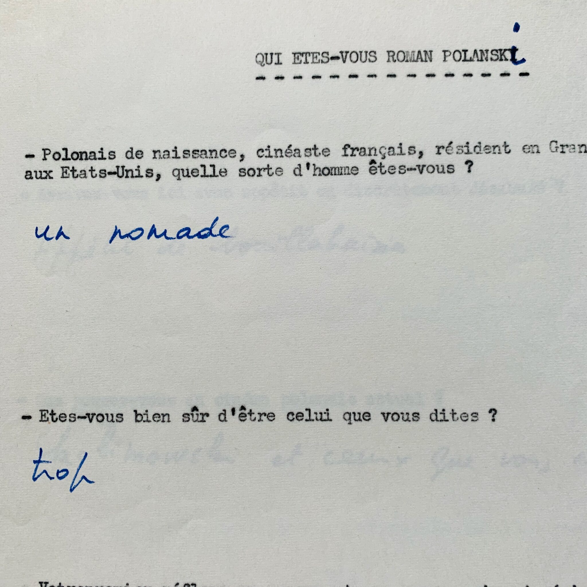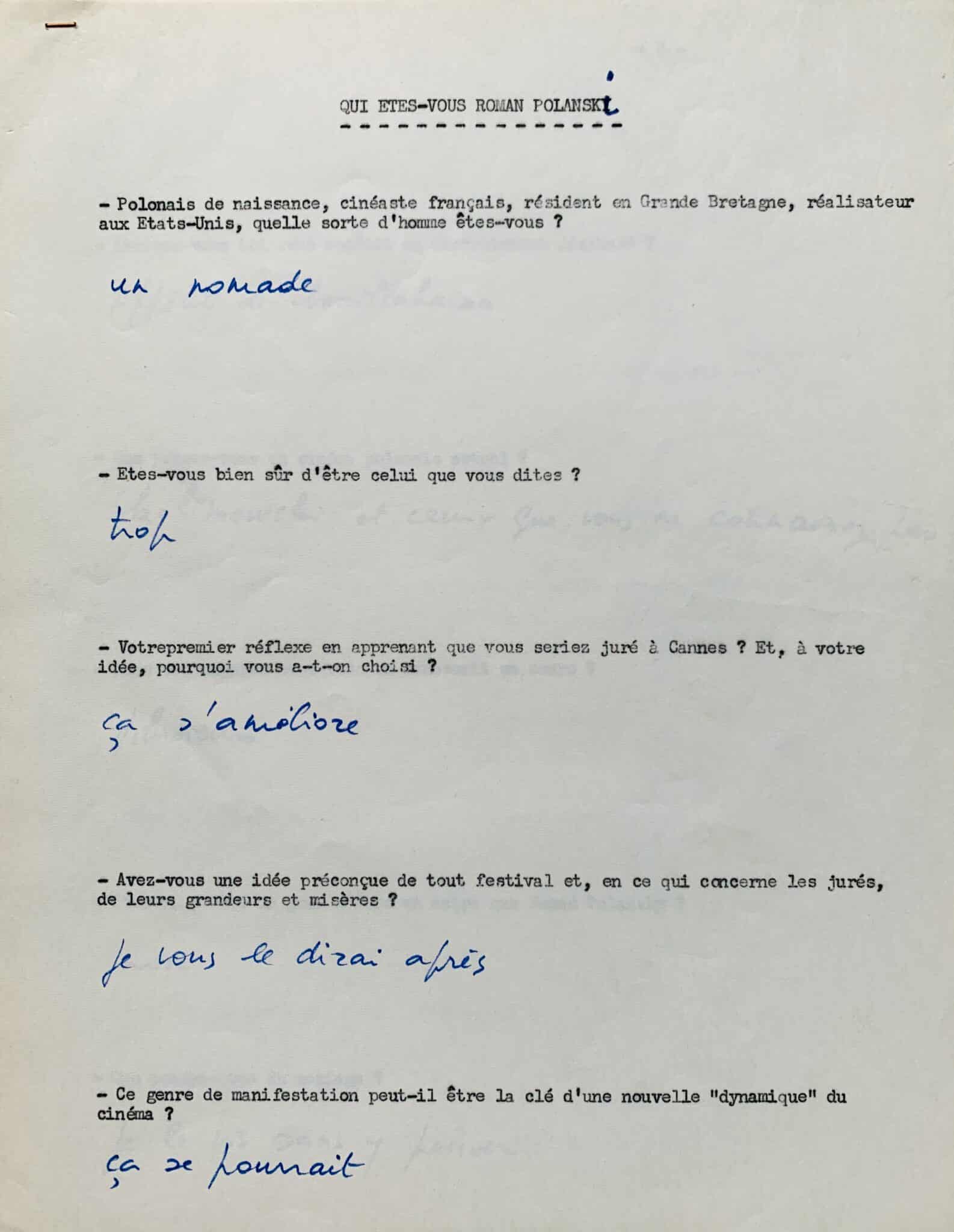 Réponses de la main de Roman Polanski à un questionnaire intitulé "Qui êtes-vous Roman Polanski", réalisé en 1968, au moment où il était membre du jury au festival de Cannes ; elles sont écrites sous 28 questions dactylographiées, et donnent d'intéressants détails sur ses goûts cinématographiques.