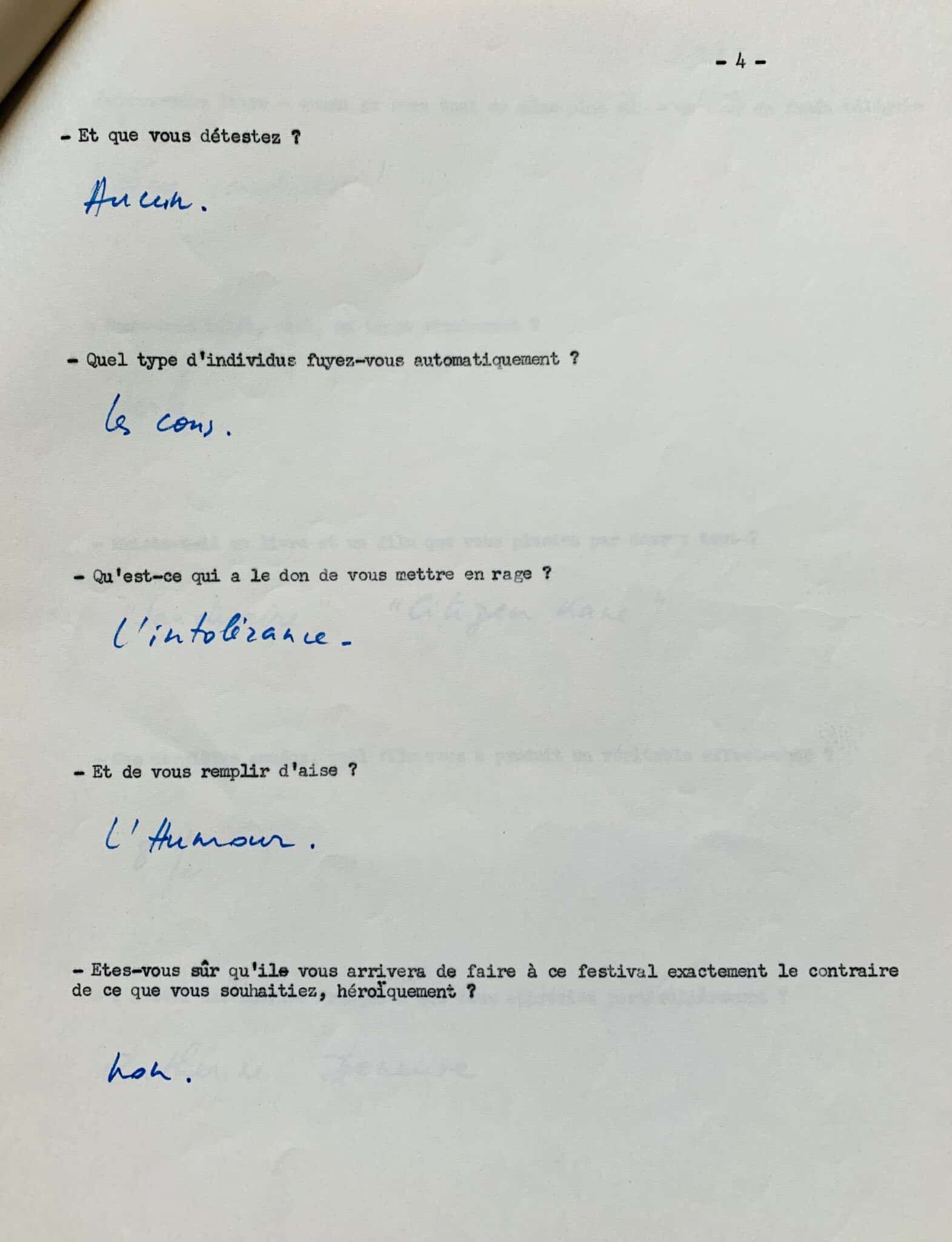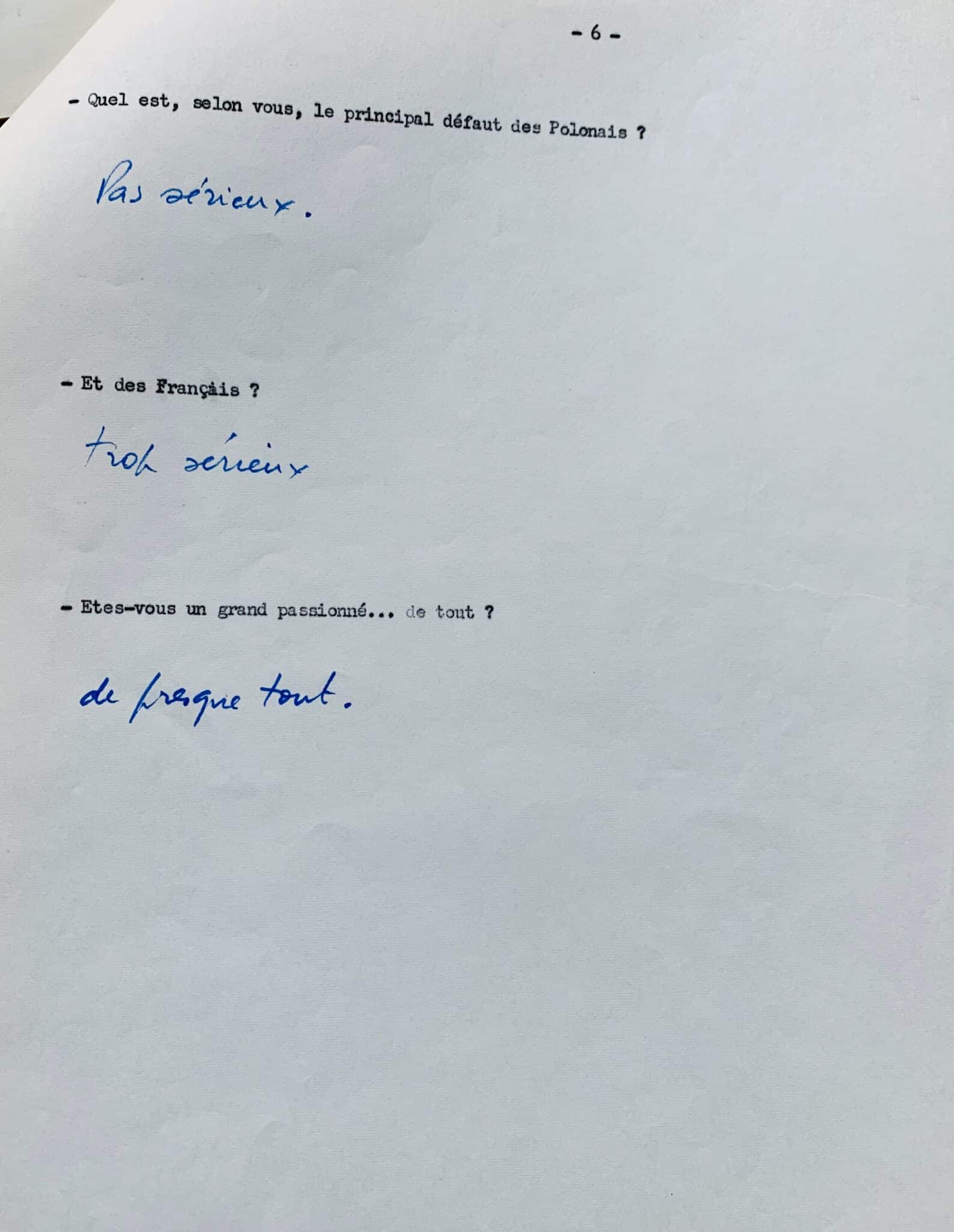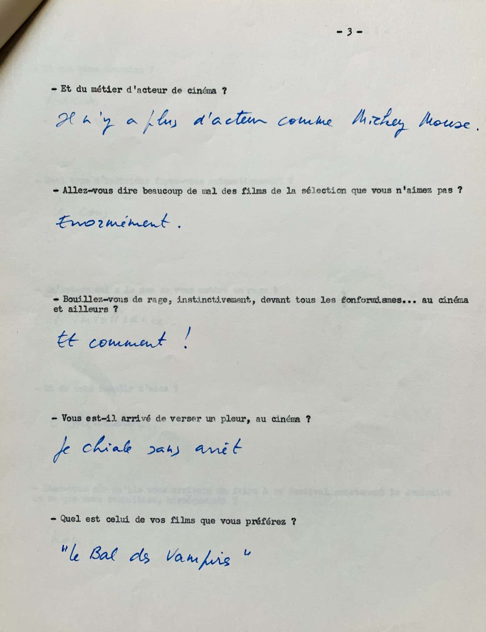 Réponses de la main de Roman Polanski à un questionnaire intitulé "Qui êtes-vous Roman Polanski", réalisé en 1968, au moment où il était membre du jury au festival de Cannes ; elles sont écrites sous 28 questions dactylographiées, et donnent d'intéressants détails sur ses goûts cinématographiques.