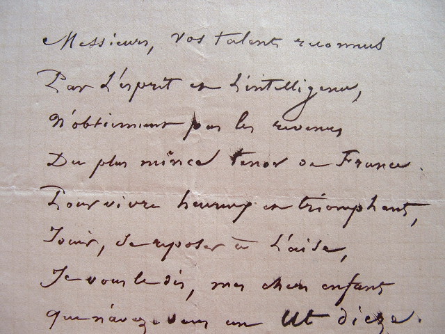 Tirade en vers du poète provençal Gustave Bénédit, adressée aux artistes du Gymnase : «Messieurs, vos talents reconnus / Par l'esprit et l'intelligence / N'obtiennent pas les revenus / Du plus mince ténor de France. / Pour vivre heureux et triomphant / Jouir, se reposer à l'aise / Je vous le dis, mes chers enfants / Que n'avez-vous un ut dièze". [Bénédit avait lui-même eu un début de carrière de chanteur d'opéra].