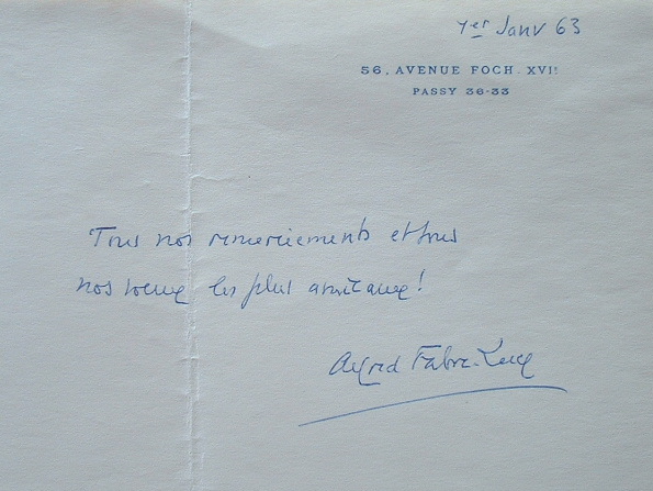 «Tous nos remerciements et tous nos voeux les plus amicaux ! Alfred Fabre-Luce».