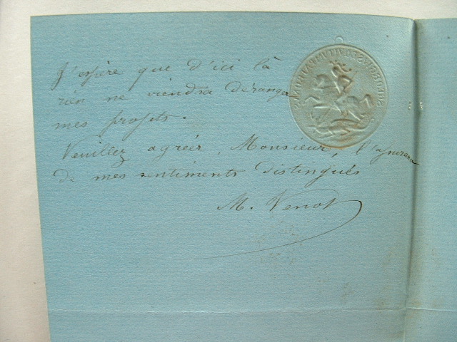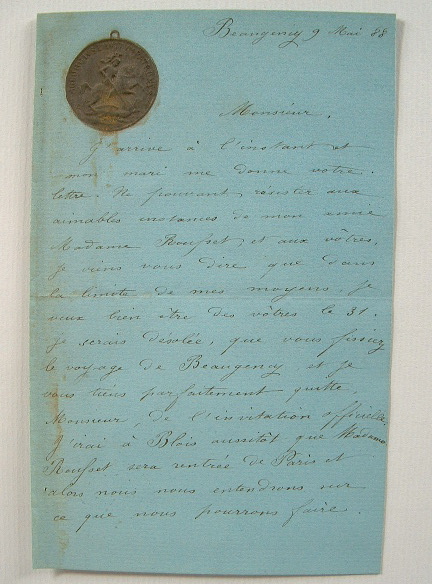 Lettre de Mme Venot, de Beaugency, relative à sa participation à une manifestation. Le papier à lettre est enrichi d'une belle médaille gaufrée et peinte, représentant Saint-Georges sur son cheval terrassant le dragon. Légende "S GEORGIUS EQUITUM PATRONUS".