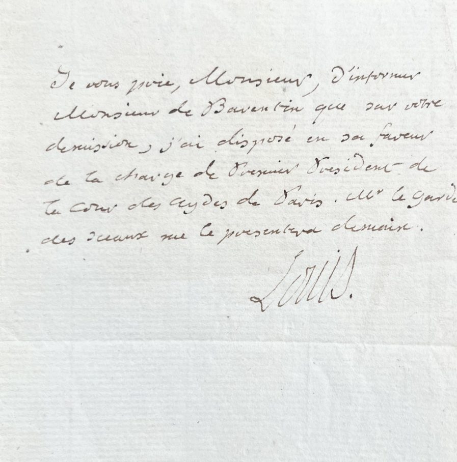 "Je vous prie, Monsieur, d'informer Monsieur de Barentin que sur votre décision, j'ai disposé en sa faveur de la charge de Premier Président de la cour de Aydes de Paris. Mr le garde des sceaux me le présentera demain. Louis".