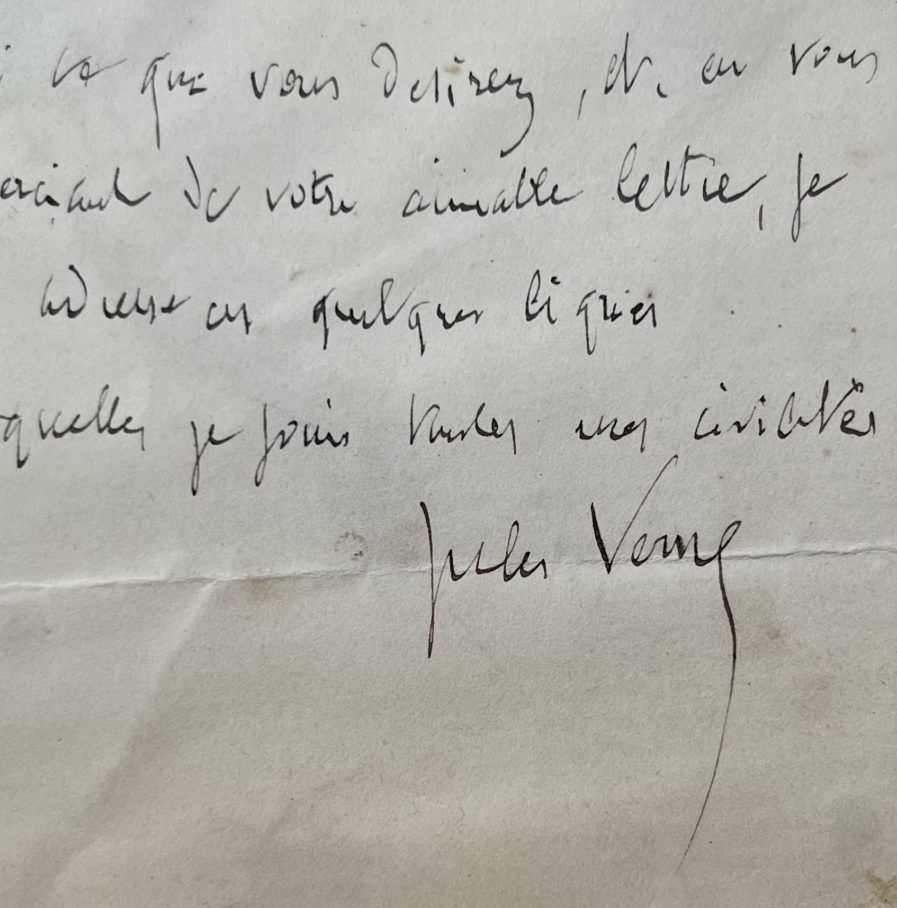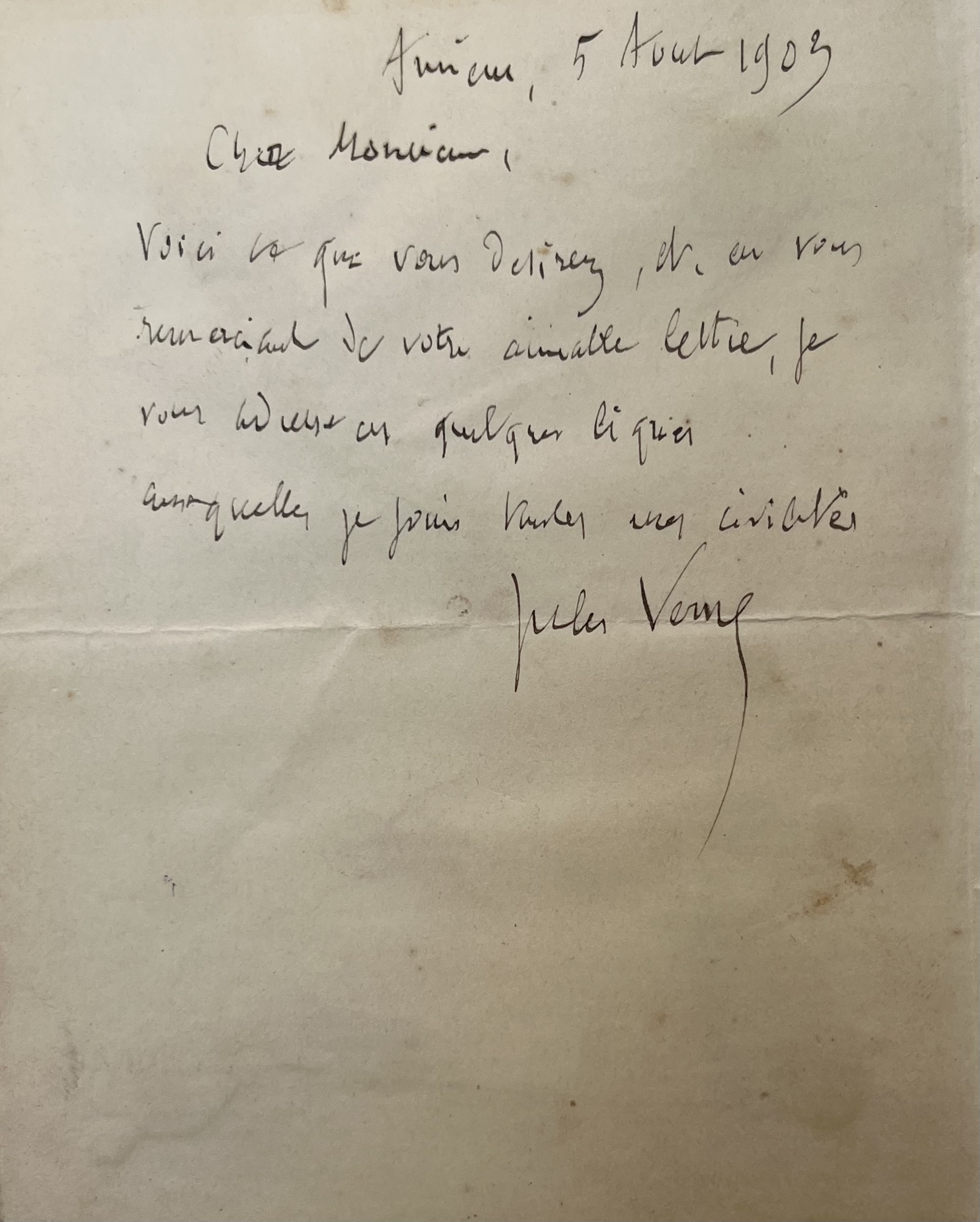 "Voici ce que vous désirez, et, en vous remerciant de votre aimable lettre, je vous adresse ces quelques lignes auxquelles je joins toutes mes civilités. Jules Verne".
