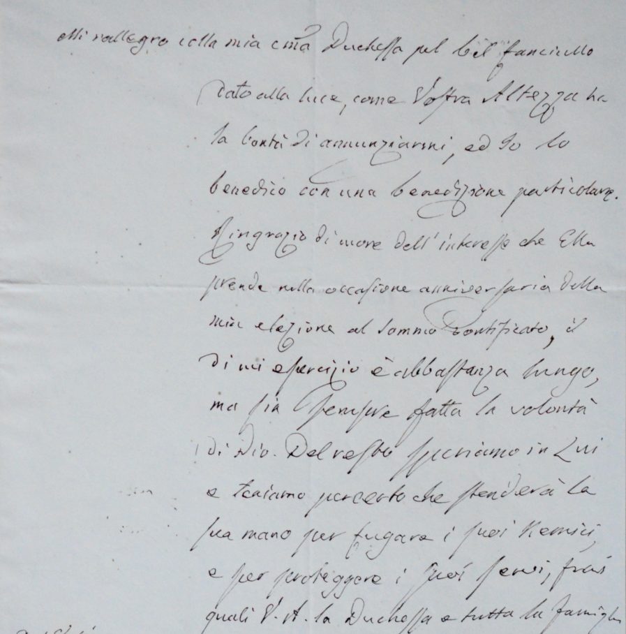 "Mi rallegro colla mia Duchessa per bel fanciullo dato alla luce, come vostra altezza ha la bontà di annunziarni ed io lo benedico con una benedizione particolare ringrazio di more dell'interesse che Ella prende nella occasione anniversaria della mia elezione al sommo Pontificate [...]".