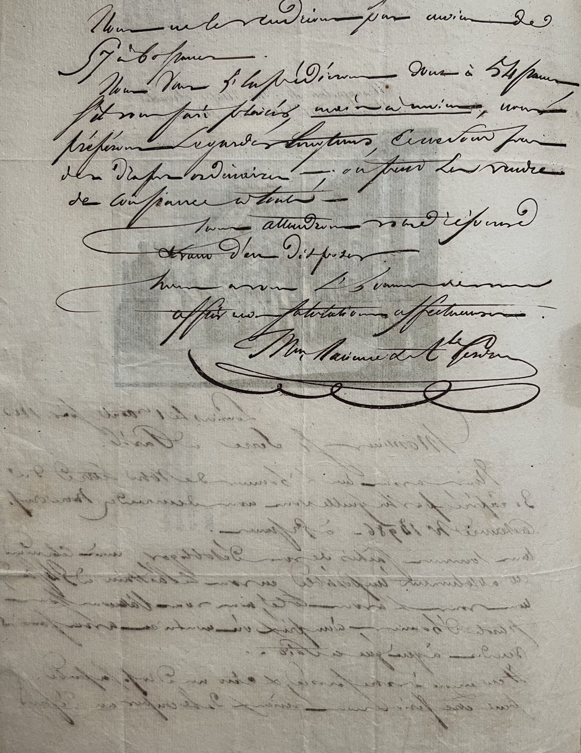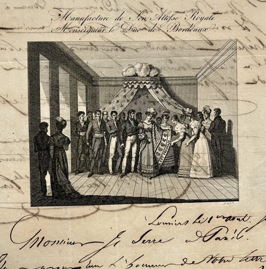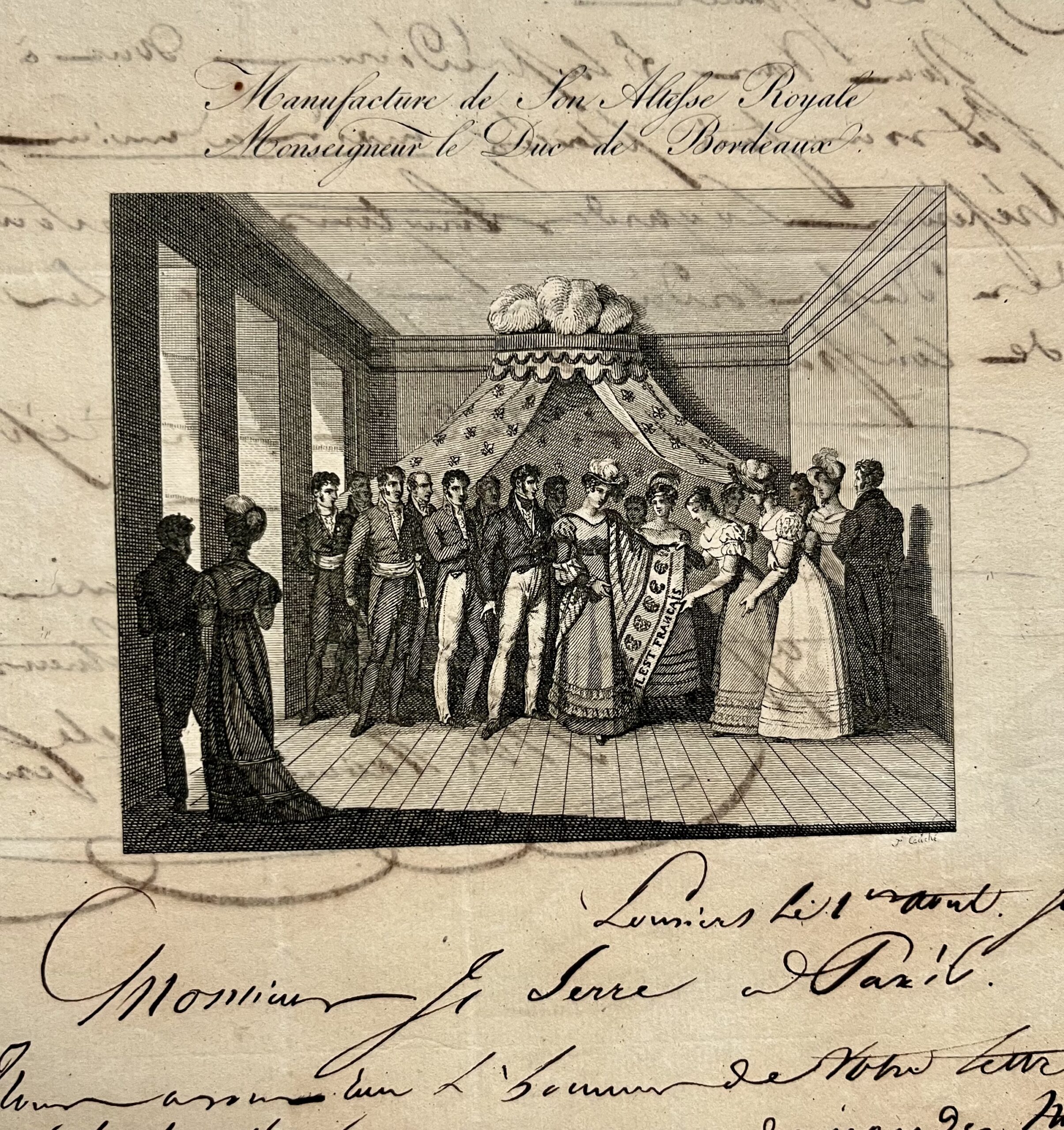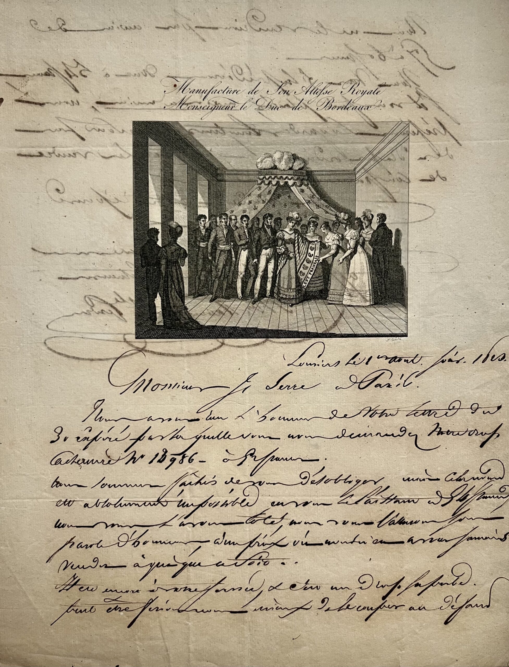 Courier à en-tête gravé d'une belle illustration de la "Manufacture de Son Altesse Royale Monseigneur le Duc de Bordeaux". Fine gravure figurant une réunion d'aristocrates, sous une tenture fleurdelisée, autour de la duchesse de Berry, à la robe élégante, présentant une étoffe sur laquelle est écrit : "Il est français" ; gravure signée "J. Cauché".