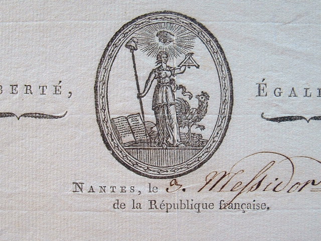 Datée du 3 messidor an 10. En-tête du commissaire du gouvernement près le tribunal criminel du département de la Loire Inférieure, avec jolie vignette allégorique dans un médaillon.