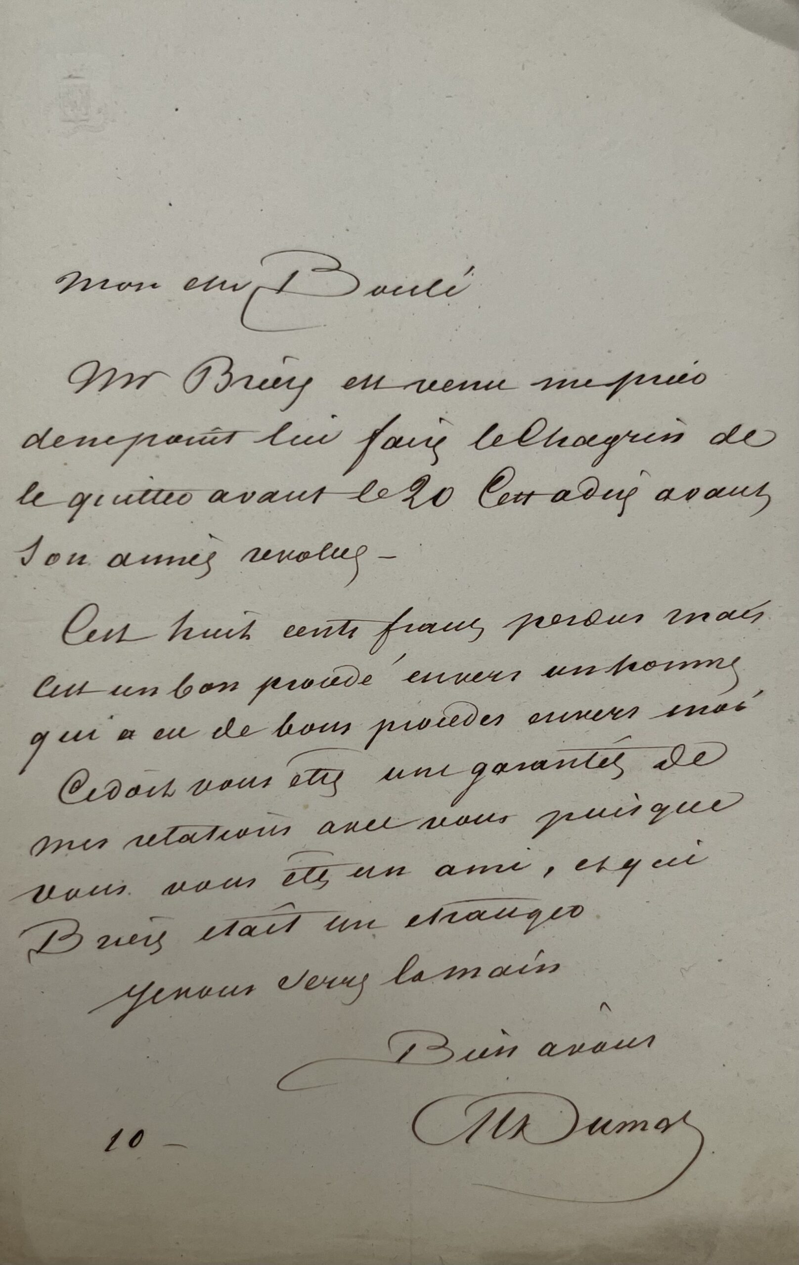 "Mon cher Boulé. Mr Brière est venu me prier de ne point lui faire le chagrin de le quitter avant le 20 c'est-à-dire avant son année révolue. C'est huit cents francs perdus mais c'est un bon procédé envers un homme qui a eu de bons procédés envers moi. Ce doit vous être une garantie de mes relations avec vous puisque vous vous êtes un ami, et que Brière était un étranger. Je vous serre la main".