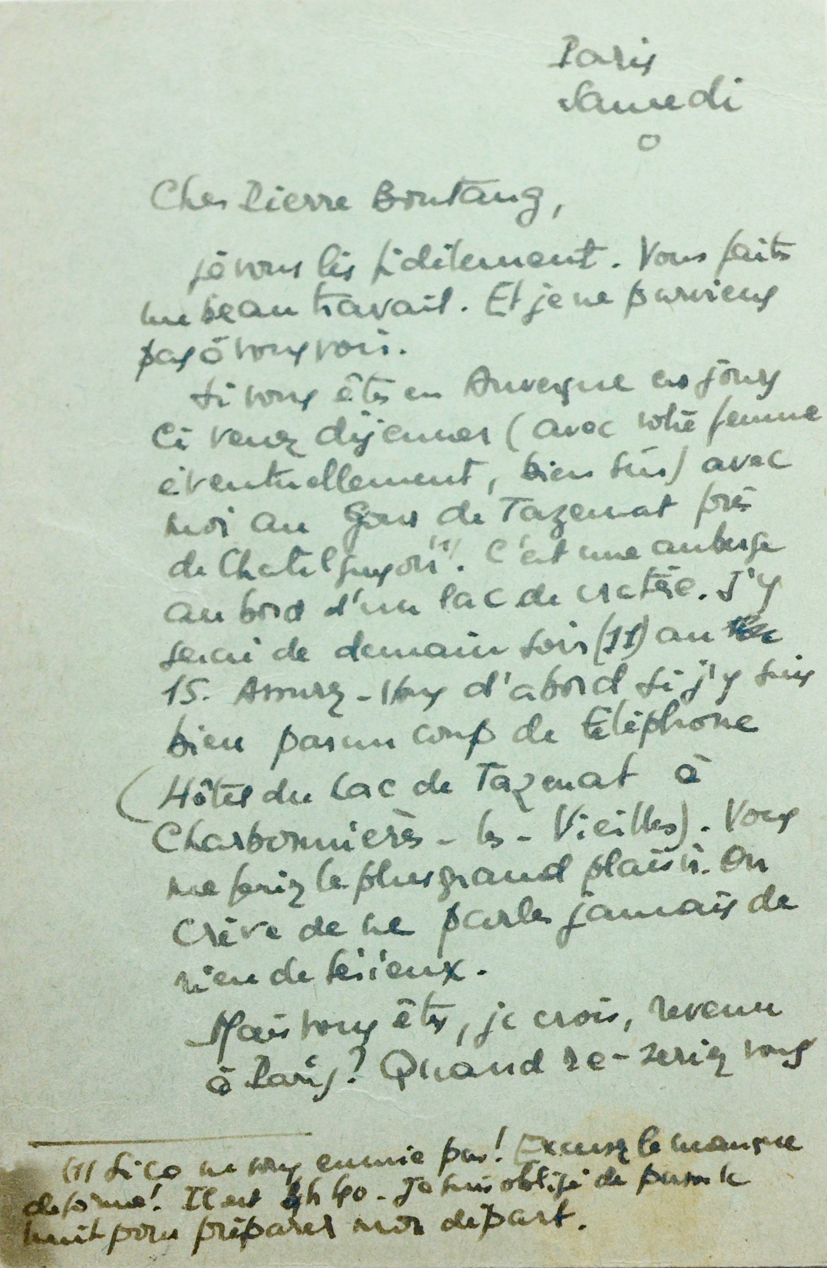 "Cher Pierre Boutang, Je vous lis fidèlement. Vous faites un beau travail. Et je ne parviens pas à vous voir. Si vous êtes en Auvergne ces jours-ci venez déjeuner (avec votre femme éventuellement bien sûr) avec moi au Gour de Tazenat près de Châtel Guyon(1) (Si ça ne vous ennuie pas ! Excusez le manque de forme ! Il est 4h40. Je suis obligé de passer la nuit pour préparer mon départ ) [...]". Il le convie dans une auberge, près de Charbonnières-les-Vieilles, où il réside "vous me feriez le plus grand plaisir. On crève de ne parler jamais de rien de sérieux. Mais vous-êtes je crois, revenu à Paris [...]".