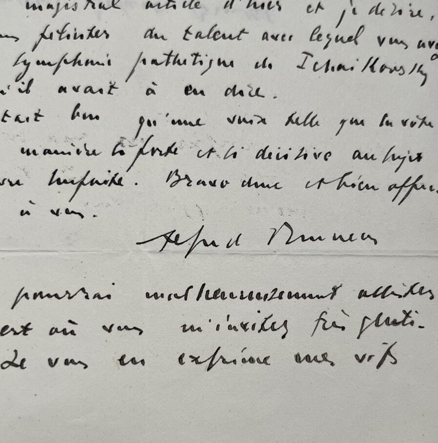 "Mon cher ami, je veux vous remercier de m'avoir nommé dans votre article magistral article d'hier et je désire, en outre, vous féliciter du talent avec lequel vous avez dit de la symphonie pathétique de Tchaikovsky tout ce qu'il y avait à en dire. Il était bien qu'une voix telle que la vôtre s'élevât de manière si forte et si décisive au sujet de cette oeuvre imparfaite. Bravo donc [...]. Je ne pourrai malheureusement assister au concert où vous m'invitez [...]".