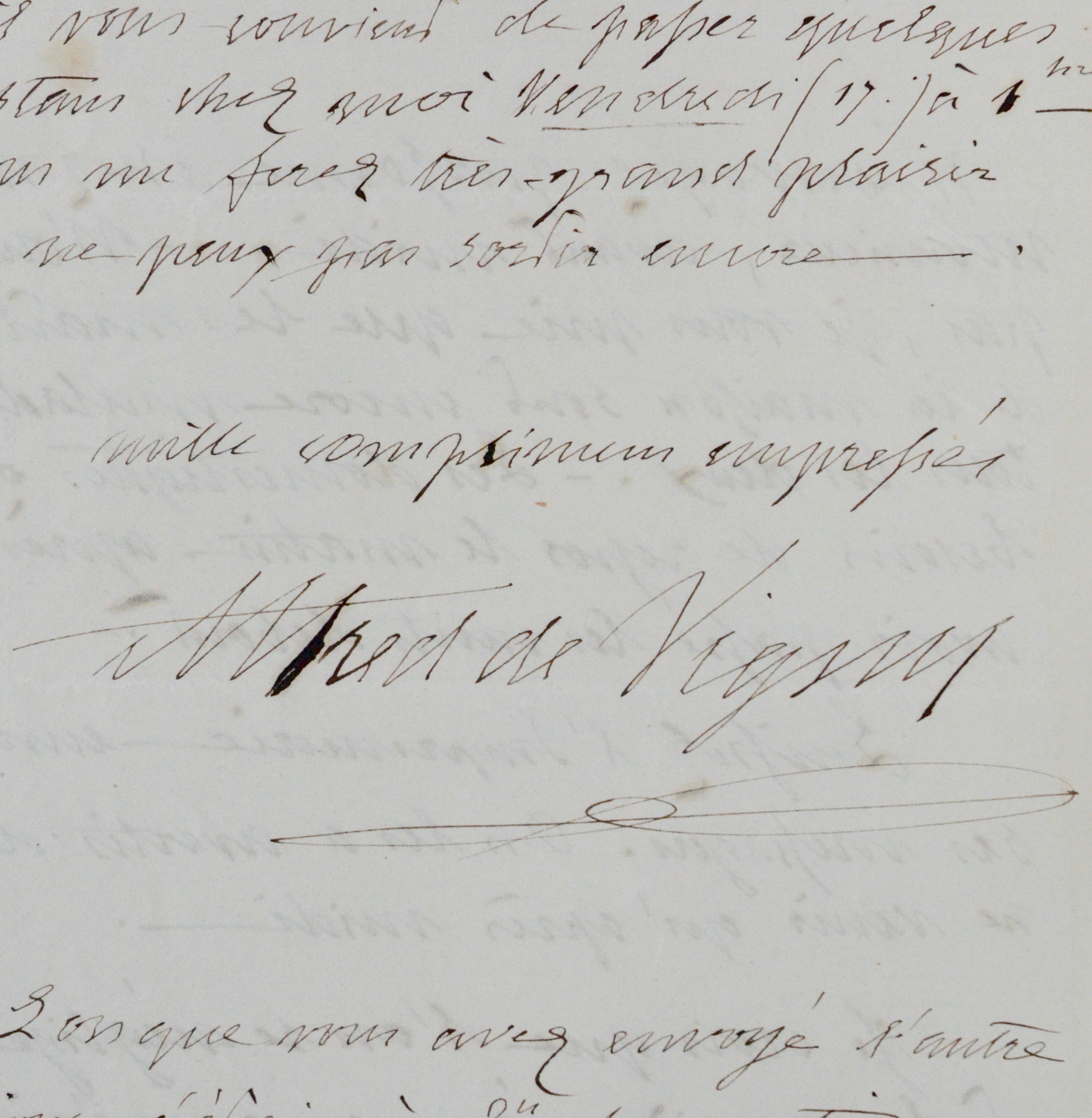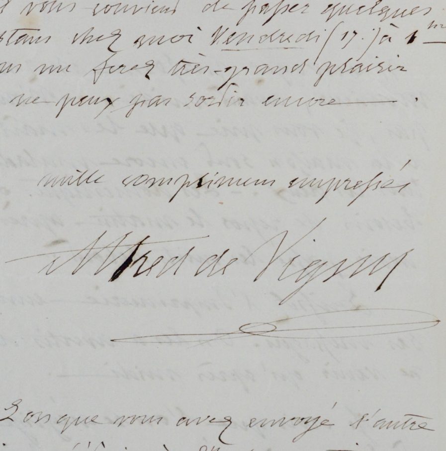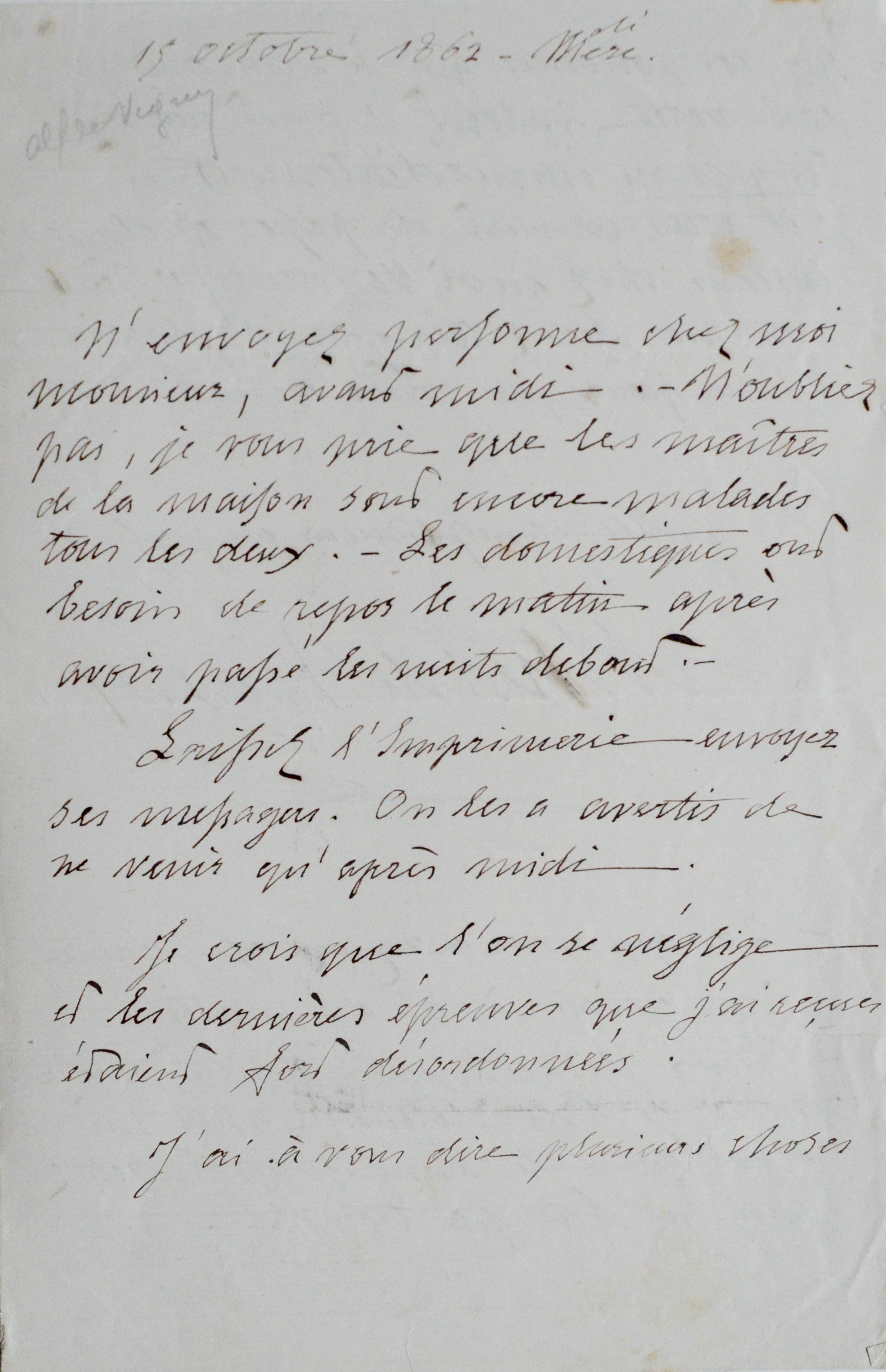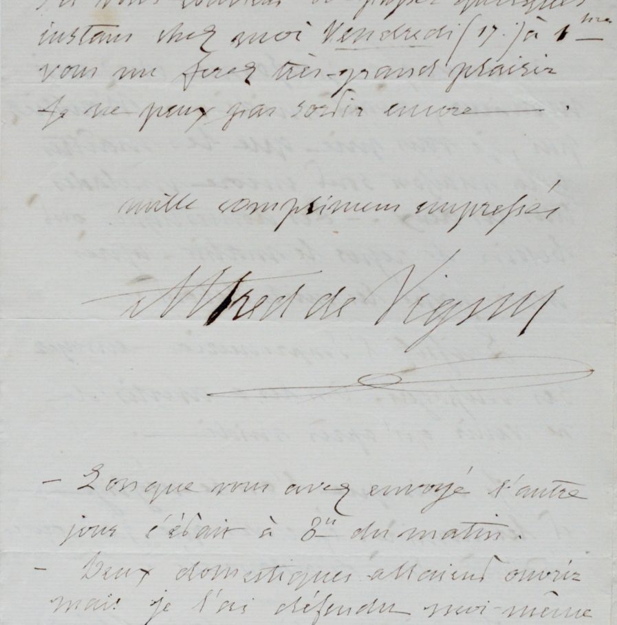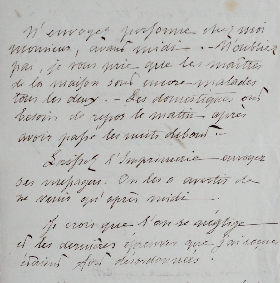 Vigny insiste auprès de son éditeur pour qu'il n'envoie personne chez lui avant midi, car "les maîtres de la maison sont encore malades tous les deux. Les domestiques ont besoin de repos le matin après avoir passé les nuits debout [...]". Il n'est pas satisfait des dernières épreuves reçues : "Je crois que l'on se néglige et les dernières épreuves que j'ai reçues étaient fort désordonnées [...]". Il ajoute "J'ai à vous dire plusieurs choses sur les volumes qui à mon avis et dans votre intérêt, doivent suivre Cinq-mars immédiatement [...]". Vigny insiste "pour que le calme nécessaire chez moi ne fût pas troublé".