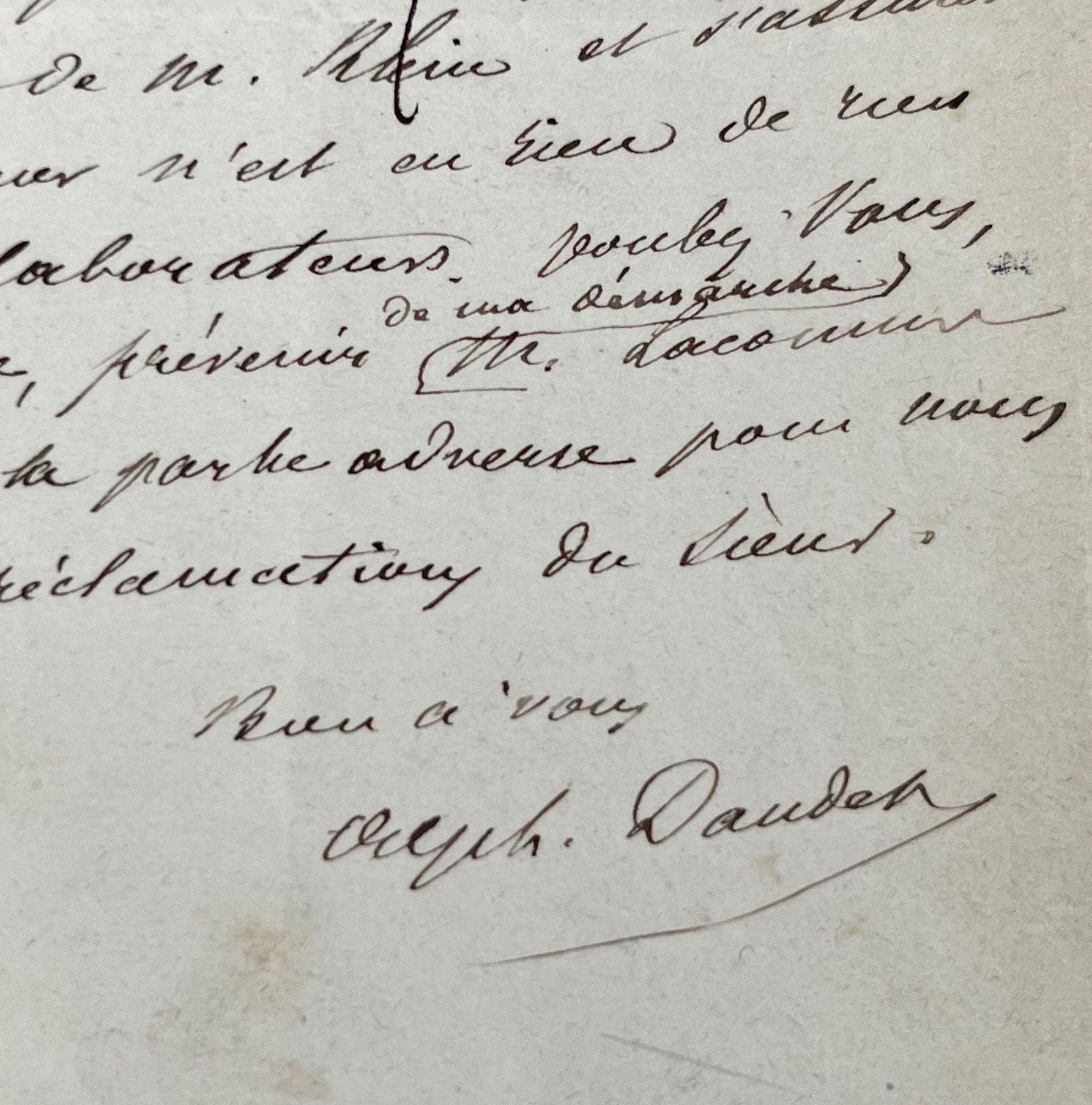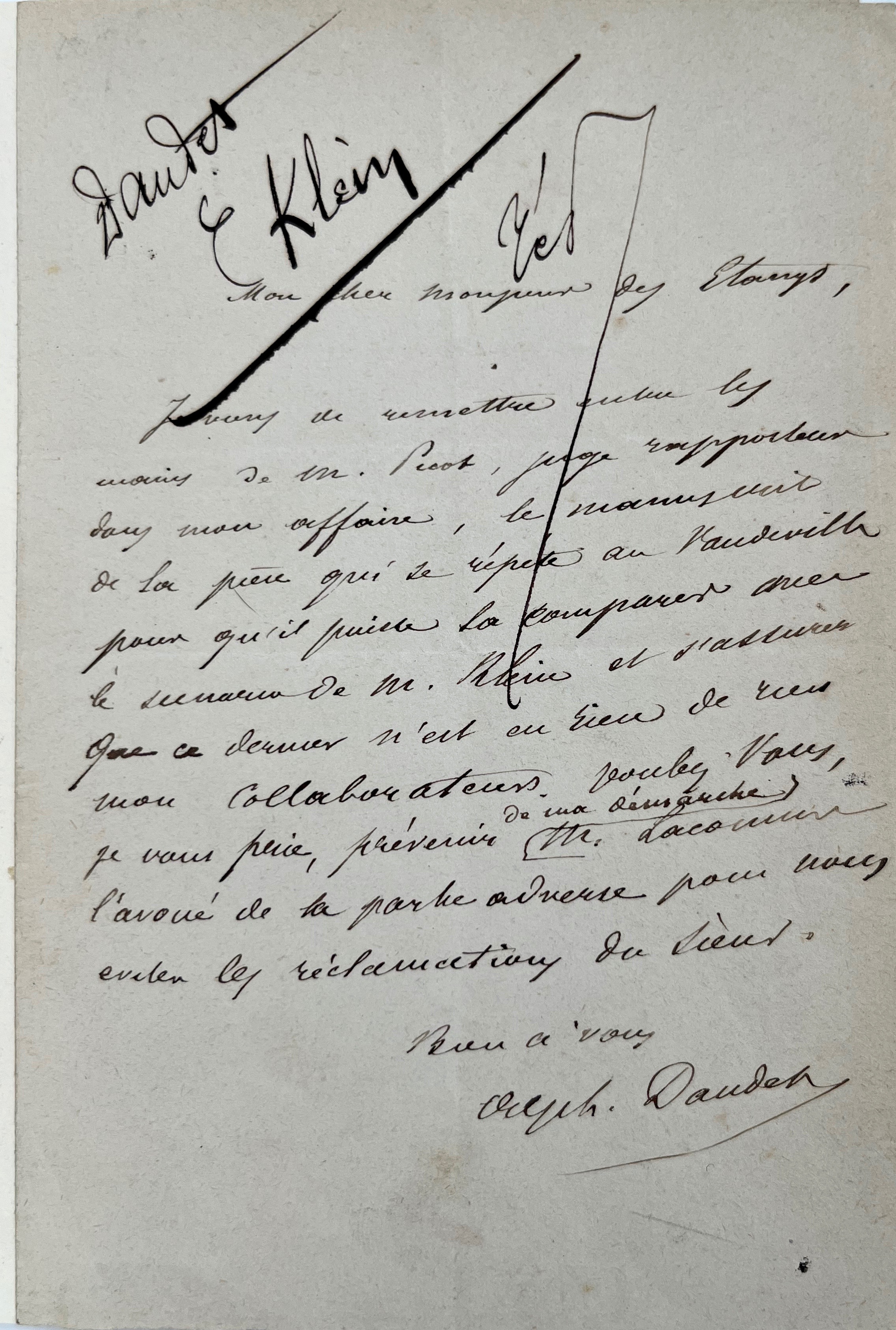 Daudet prie Des Estangs de "remettre entre les mains de M. Picot, juge rapporteur dans mon affaire, le manuscrit de la pièce qui se répète au Vaudeville pour qu'il puisse la comparer avec le scenario de M. Klein et s'assurer que ce dernier n'est en rien de rien mon collaborateur [...]". Daudet demande à ce que l'avocat de la partie adverse soit prévenu.