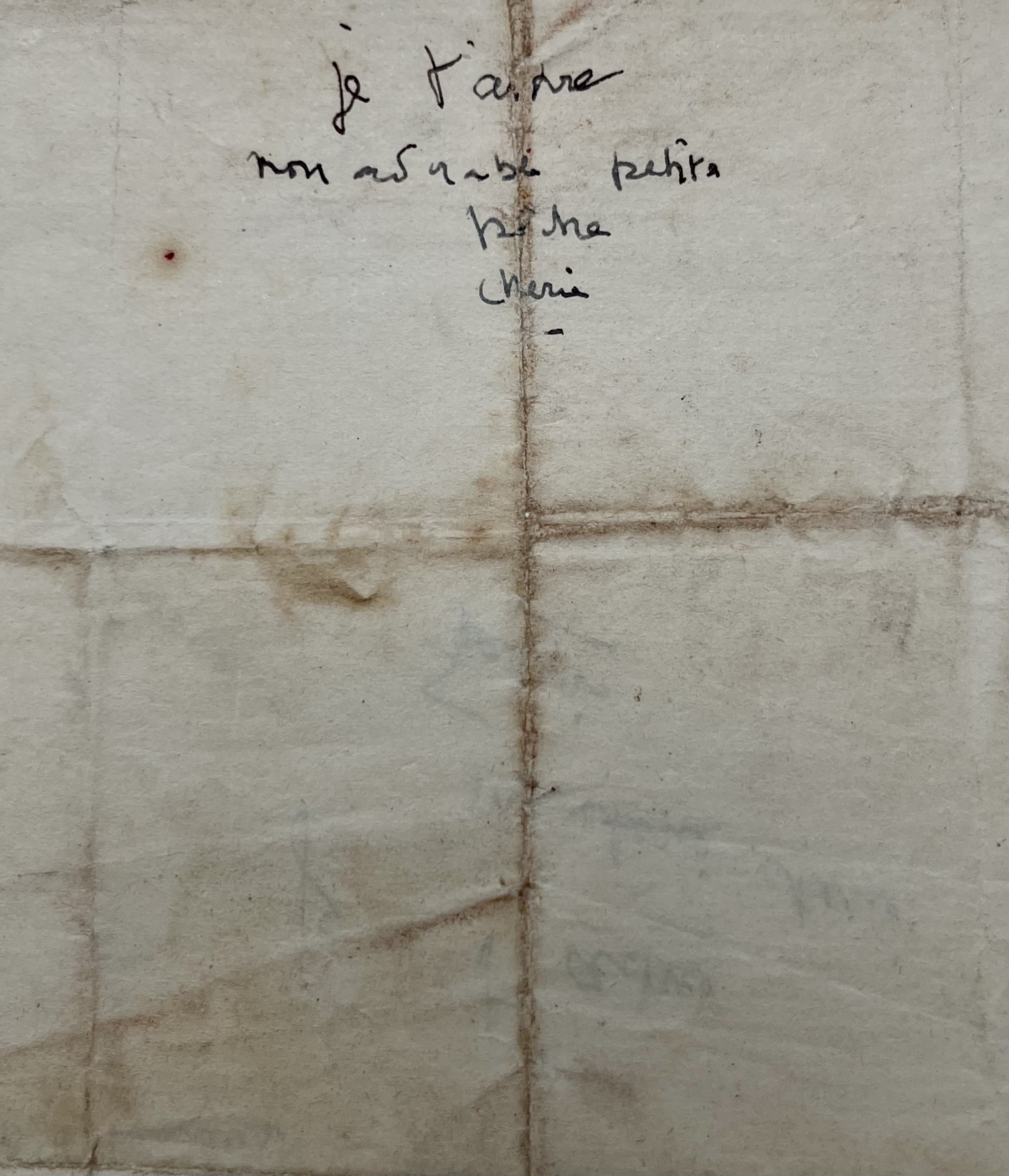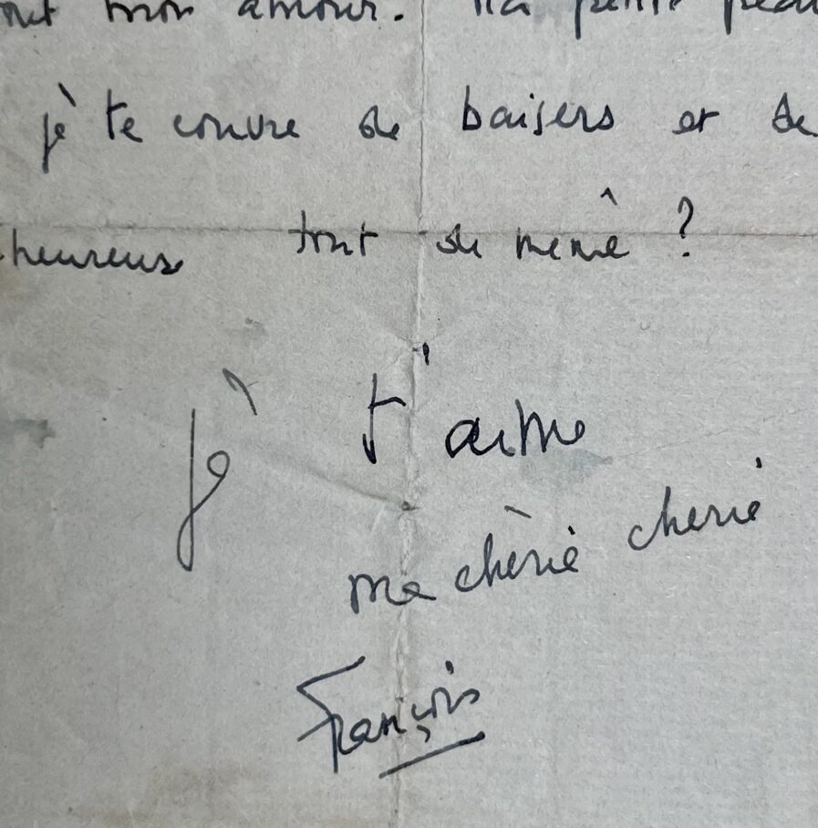 "Mon tout petit Zou, je t'adore. On bouge subitement et je ne puis t'écrire. Je t'aime follement et t'embrasse avec tout mon amour. Ma petite peau-douce chérie je te couvre de baisers et de caresses. Es-tu heureuse tout de même ? Je t'aime ma chérie chérie. François".