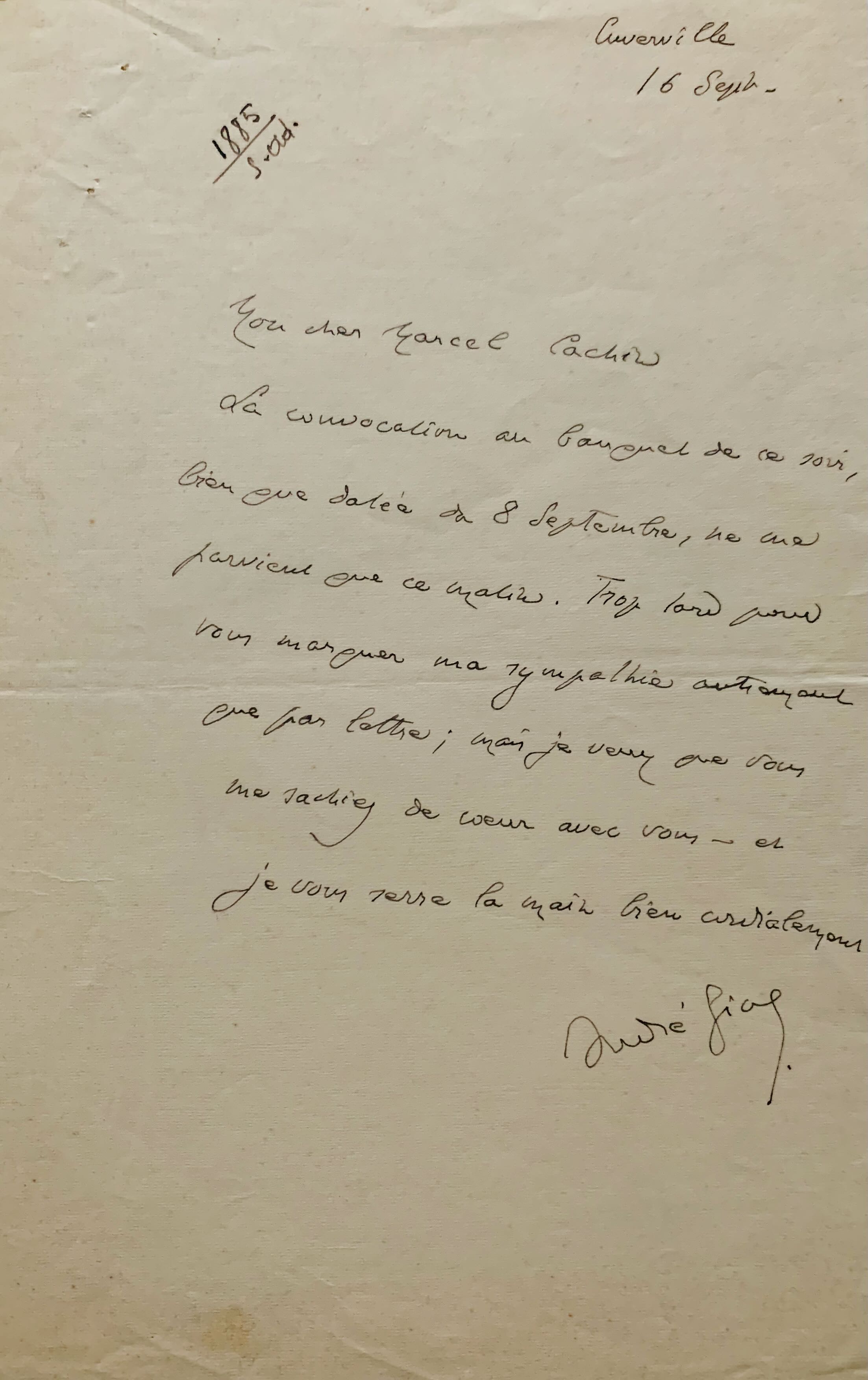 La convocation au banquet de ce soir, bien que datée du 8 septembre, ne me parvient que ce matin. Trop tard pour vous marquer ma sympathie autrement que par lettre ; mais je veux que vous me sachiez de coeur avec vous [...]".