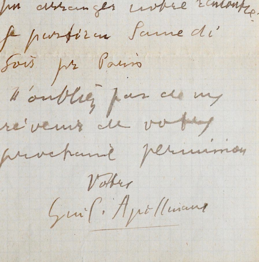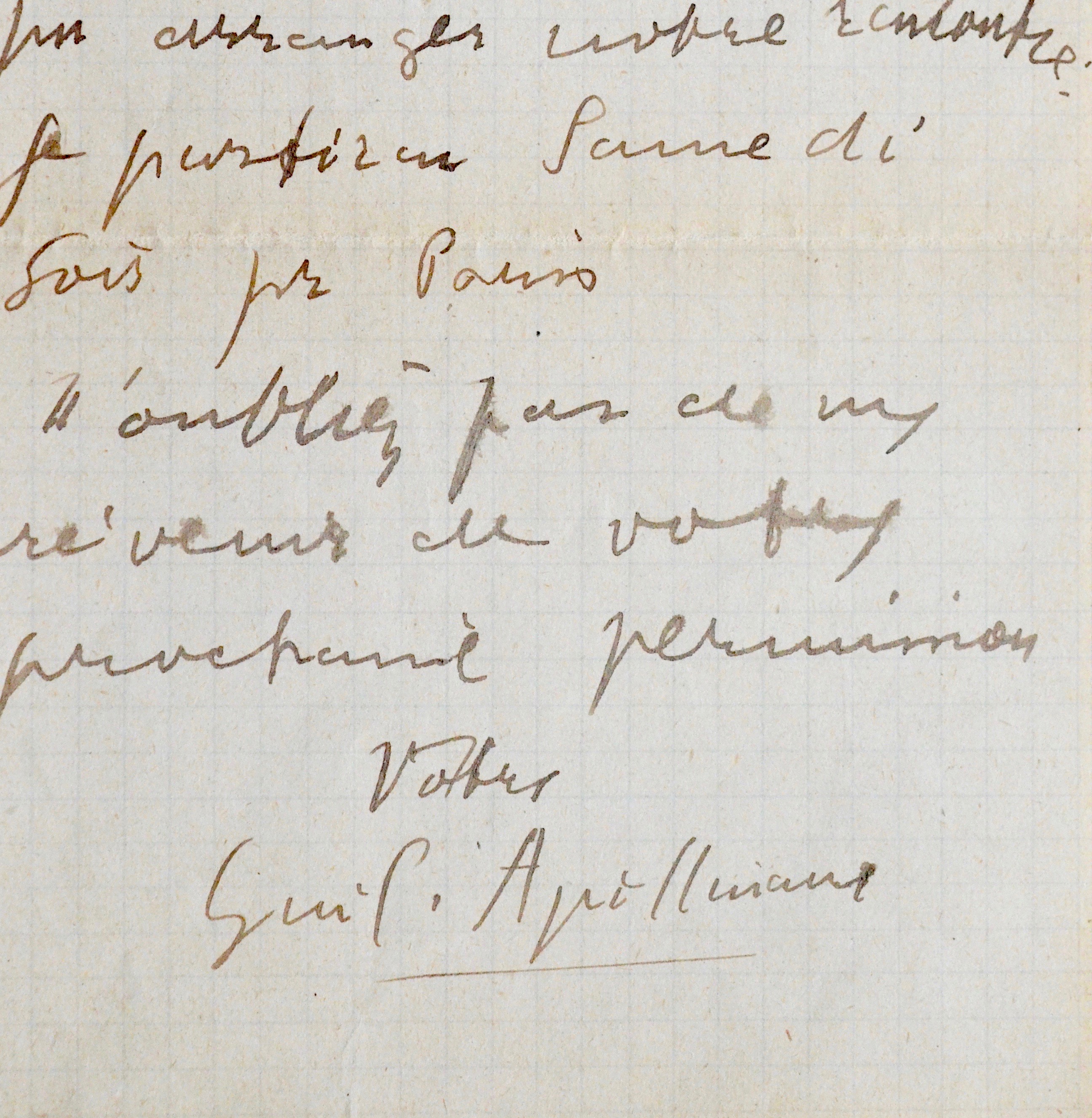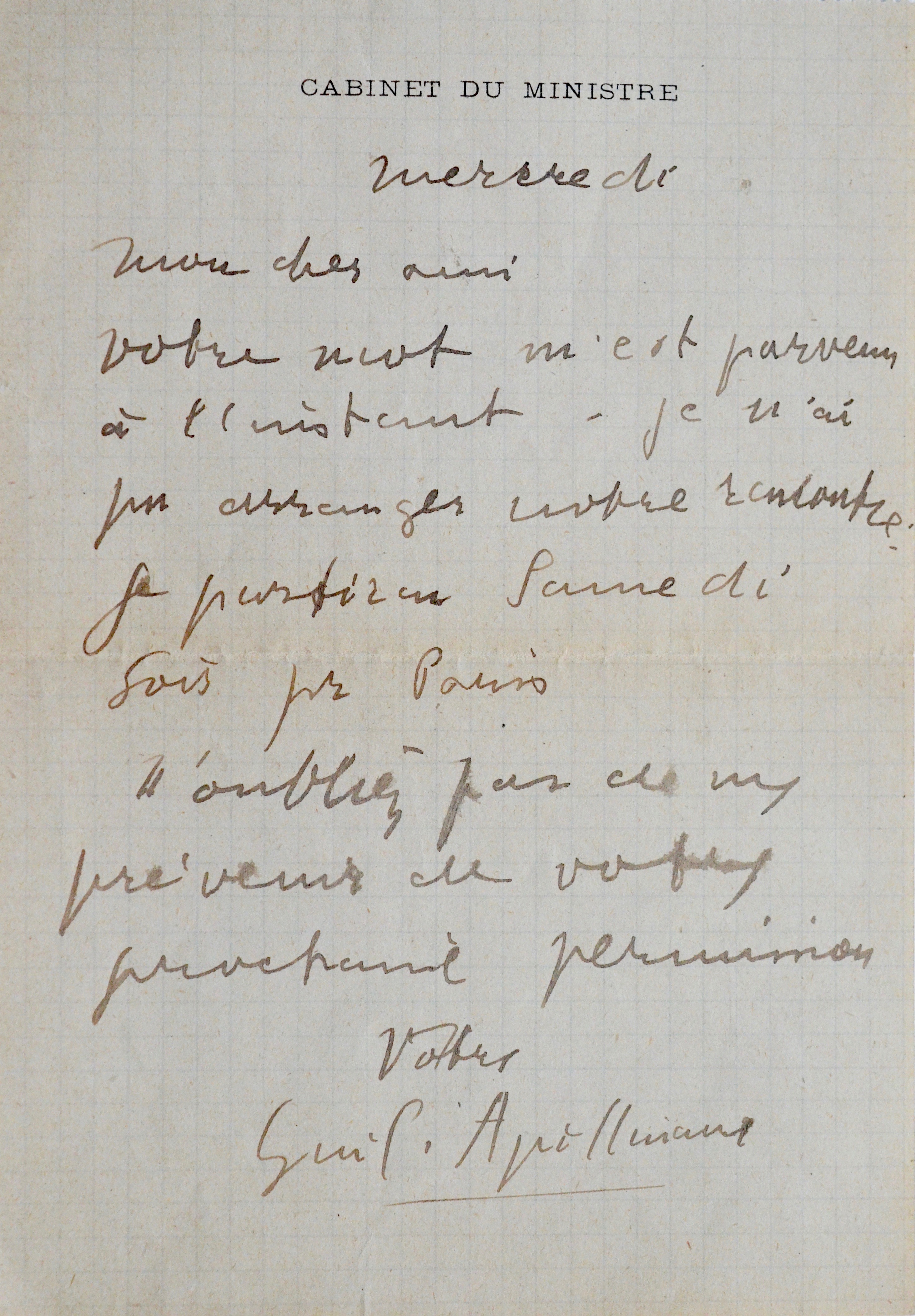 "Mon cher ami, votre mot m'est parvenu à l'instant. Je n'ai pu arranger notre rencontre : je partirai samedi soir pr Paris. N'oubliez pas de me prévenir de votre prochain permission. Votre. Gui. Apollinaire".