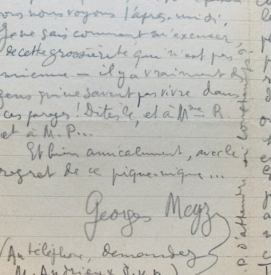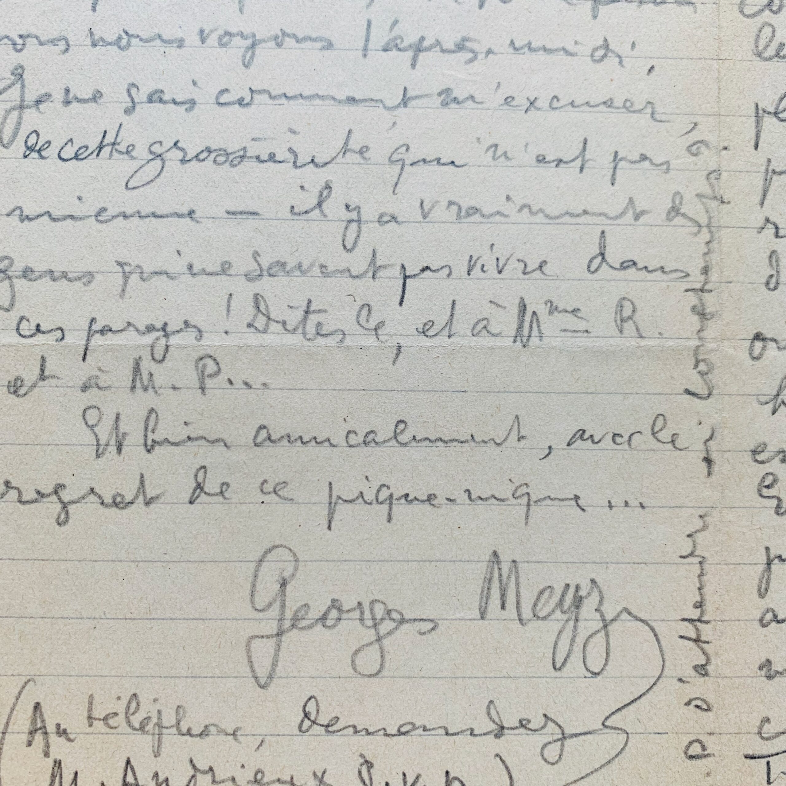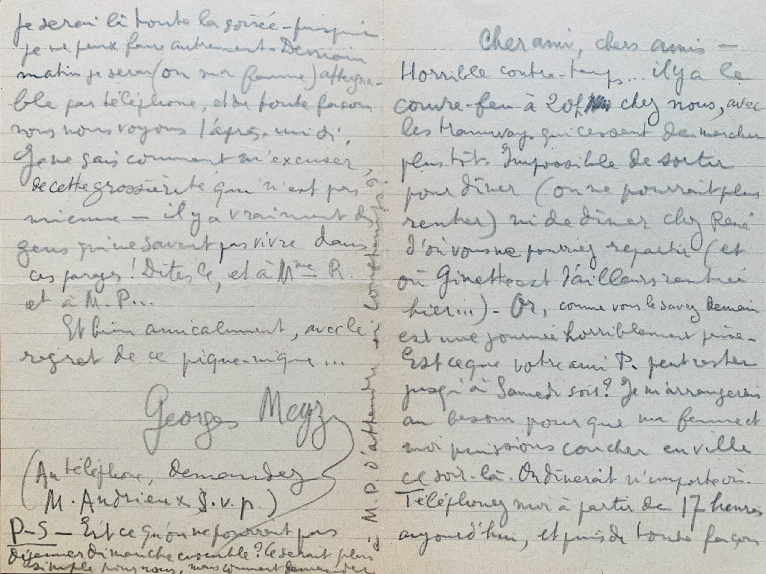 "Horrible contretemps... il y a le couvre-feu à 20h chez nous, avec les tramways qui cesseront de marcher plus tôt. Impossible de sortir pour dîner (on ne pourrait plus rentrer) ni dîner chez René d'où vous ne pourriez repartir (et où Ginette est d'ailleurs rentrée hier). Or, comme vous le savez demain est une journée horriblement prise. Est-ce que votre ami P. peut rester jusqu'à samedi soir? Je m'arrangerais au besoin pour que ma femme et moi puissions coucher en ville ce soir-là. On dînerait n'importe où. Téléphonez-moi à partir de 17 heures aujourd'hui, et puis de toute façon je serai là toute la soirée - puisque je ne peux faire autrement. Demain matin je serai (ou ma femme) atteignable par téléphone, et de toute façon nous nous voyons l'après-midi. Je ne sais comment m'excuser de cette grossièreté qui n'est pas mienne. Il y a vraiment des gens qui ne savent pas vivre dans ces parages! Dites-le , et à Mme R. et à M. P... Et bien amicalement, avec le regret de ce pique-nique... Georges Meyz. (Au téléphone, demandez M. Andrieux s.v.p.)
