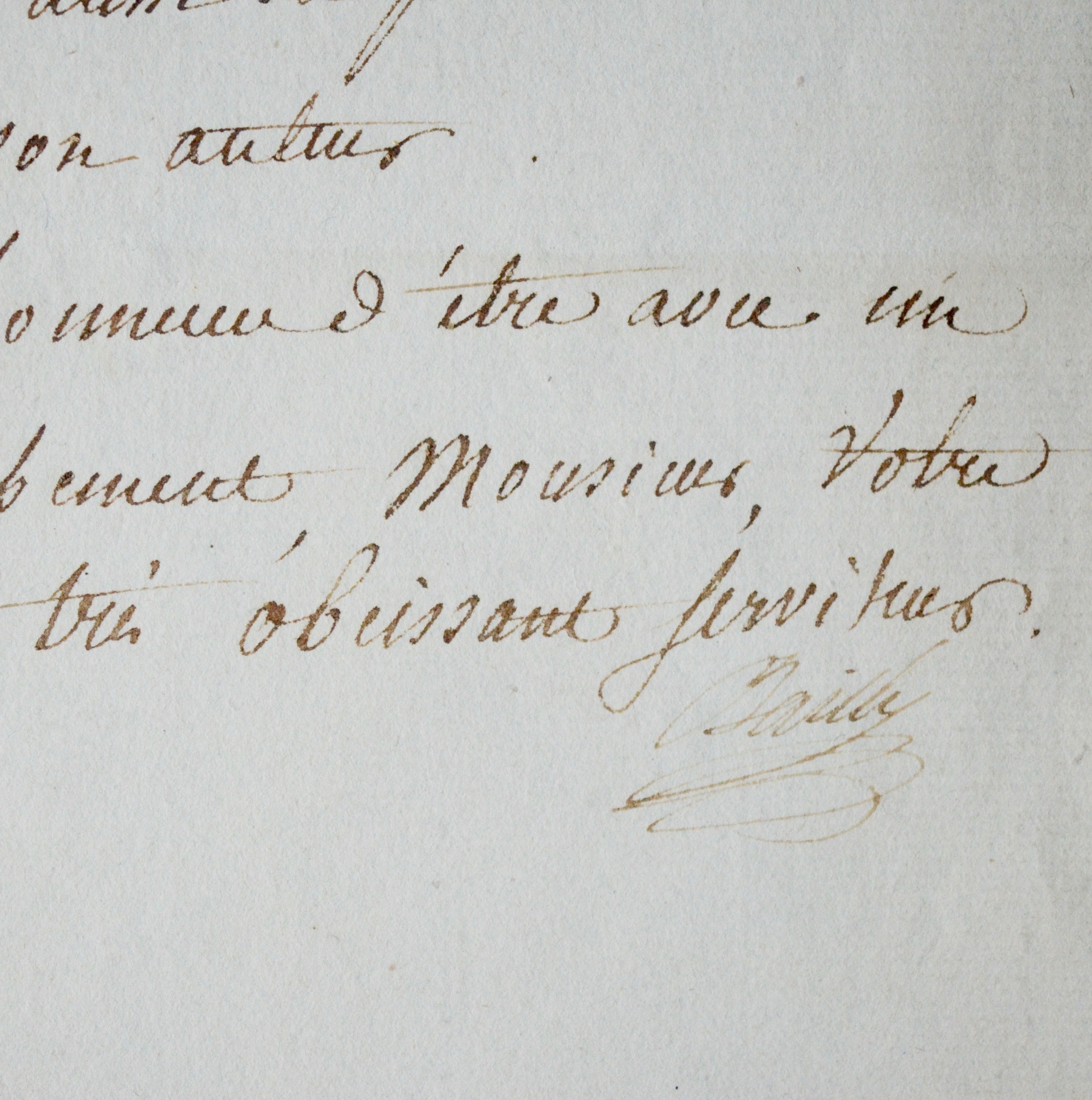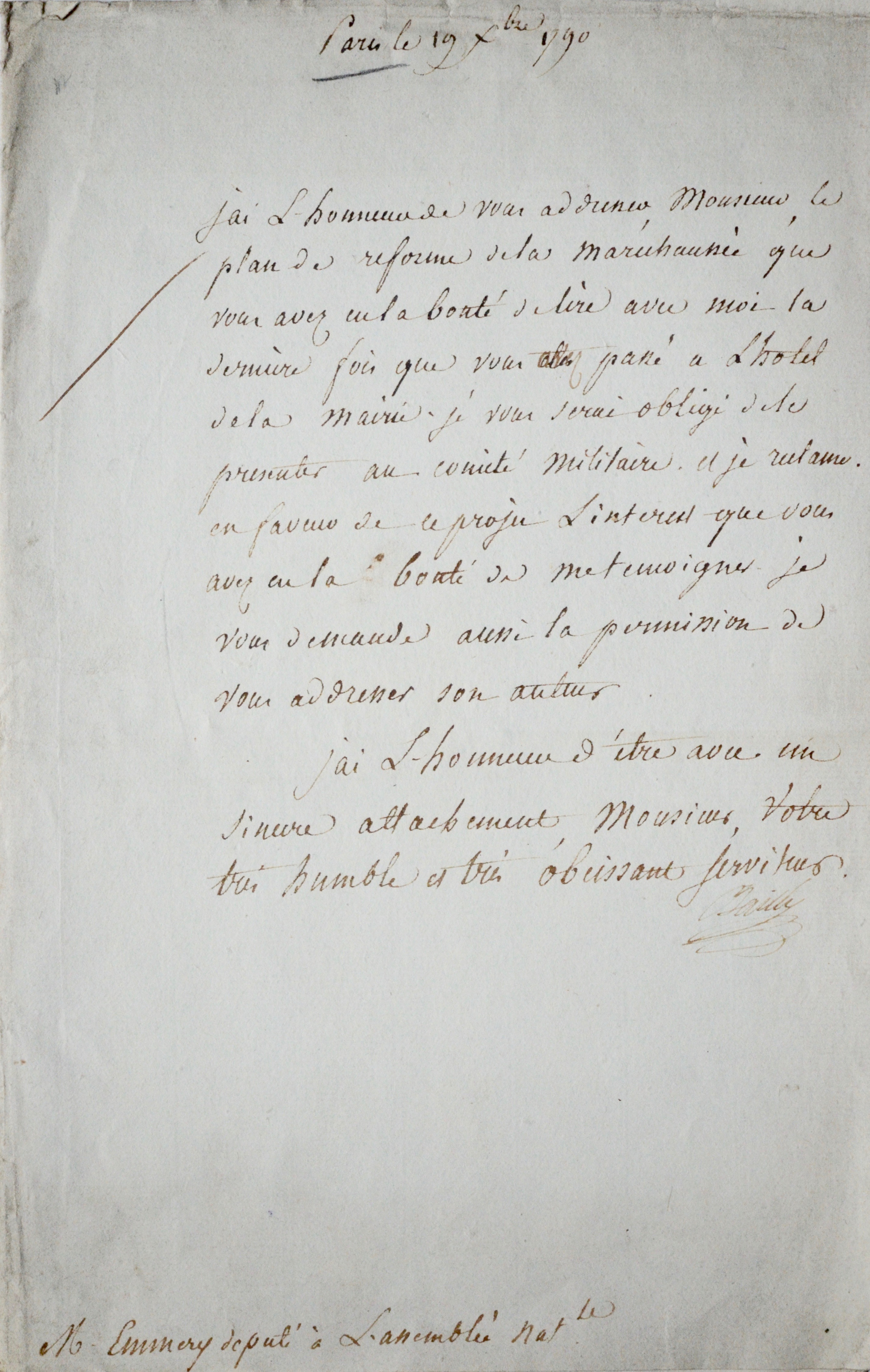 "J'ai l'honneur de vous adresser, Monsieur le plan de reforme de la maréchaussée que vous avez eu la bonté de lire avec moi la dernière fois que vous avez passé a l'hôtel de la mairie. Je vous serai obligé de le présenter un comité militaire et je réclame en faveur de ce projet l'interest que vous avez eu la bonté de me témoigner. Je vous demande aussi la permission de vous adresser son auteur [...]".