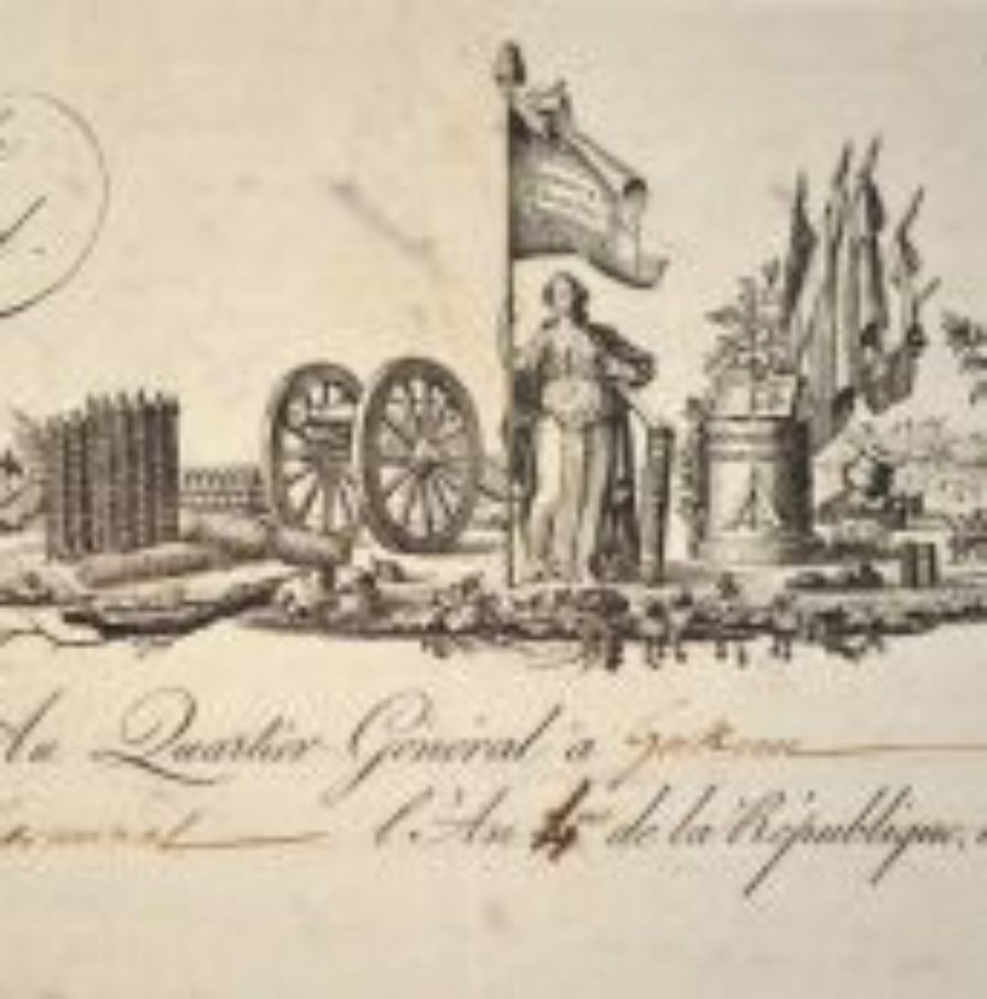 Datée du 30 germinal an 4. Ornée d'une très belle et grande vignette de l'Armée du Nord [Boppe et Bonnet planche n°66]. En-tête du général en chef de l'Armée du Nord.