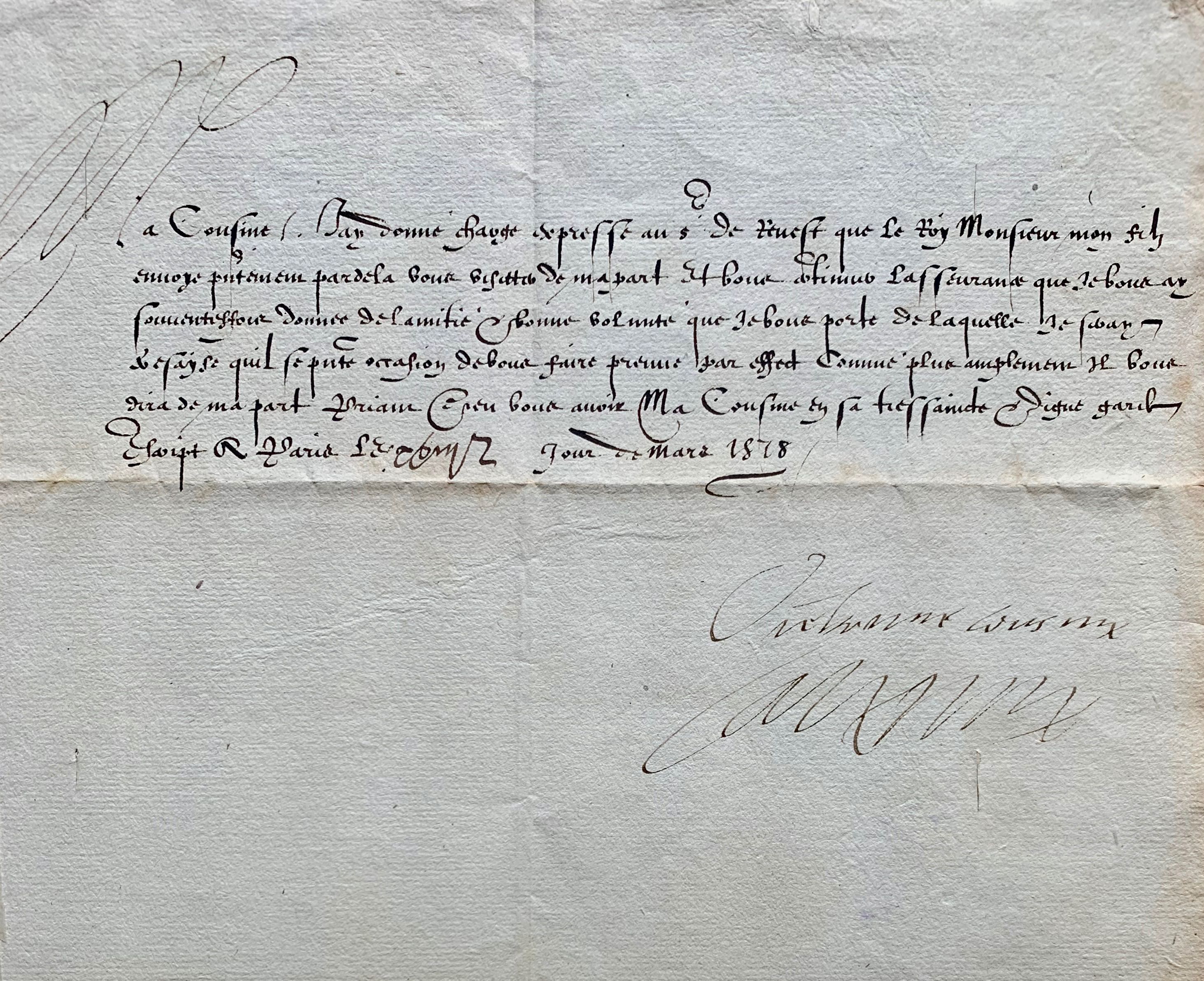 "Ma cousine, Jay donné charge expresse au Sr de Revest que Le Roy Monsieur mon fils [Henri III], envoye présentement par dela vous visiter de ma part et vous continuer l'assurance que je vous ay souventes fois donnée de l'amitié & bonne volonté que je vous porte de laquelle je seray très ayse quil se présente occasion de vous faire preuve par effect comme plus amplement il vous dira de ma part priant Dieu vous avoir Ma Cousine en sa très saincte et digne garde". Elle ajoute une ligne de sa main "Vre bonne cousine" et signe "Caterine".