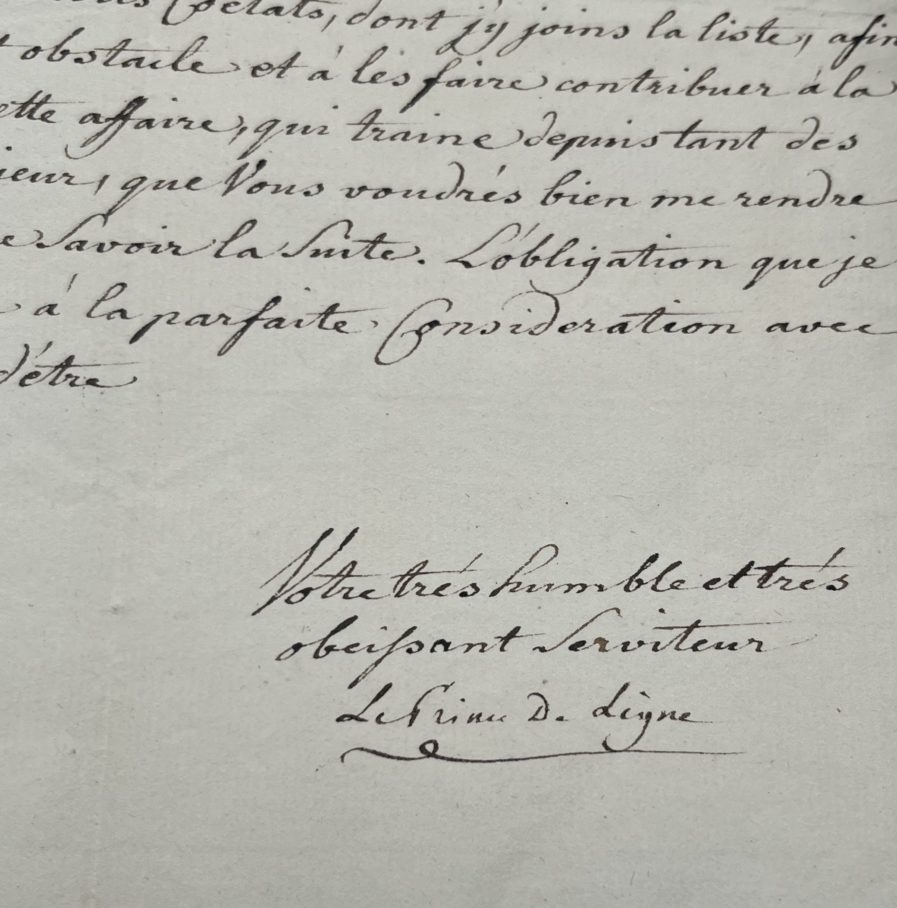 « Je viens d’apprendre avec une extrême surprise, que bien loin de voir finir l’affaire d’incorporation de ma terre souveraine de Fagnoelle dans le Cercle de Westphalie, il est survenu une protestation de 4 co-états dudit cercle contre tout ce qu’il s’est fait jusqu’icy parce qu’ils ont été totalement oubliés d’avoir communication de cette affaire […] ». Le Prince de Ligne demande à son correspondant de « prendre instamment les mesures nécessaires pour contenter lesdits coétats » dont il joint la liste pour que cette affaire « qui traine depuis tant d’années » cesse.
