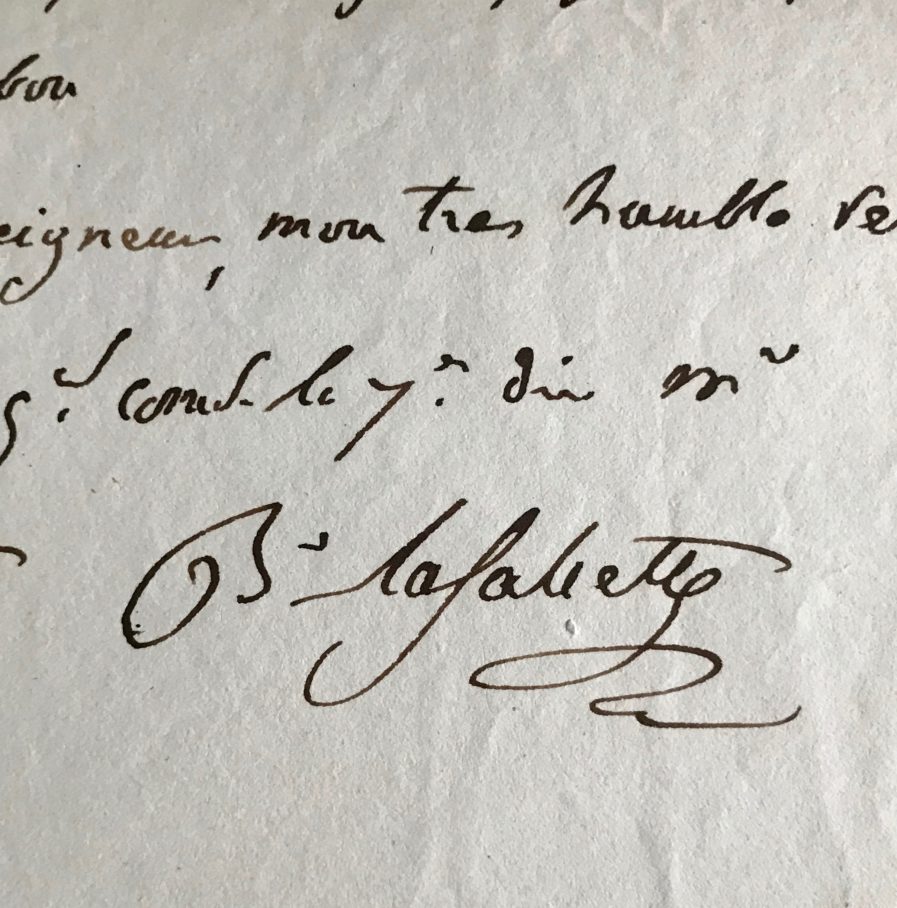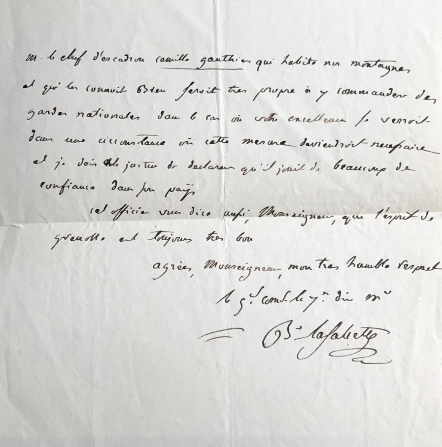Lettre du général Jean-Jacques-Bernard Colaud de La Salcette, adressée à "Mr le Grand maréchal comte Bertrand major général", durant le « vol de l'aigle ». Il recommande un certain Camille Gauthier "qui habite nos montagnes et qui les connait bien [qui] serait très propre à y commander des gardes nationales dans le cas où votre excellence se verrait dans une circonstance où cette mesure deviendrait nécessaire". Il ajoute qu'il jouit de beaucoup de confiance dans son pays.