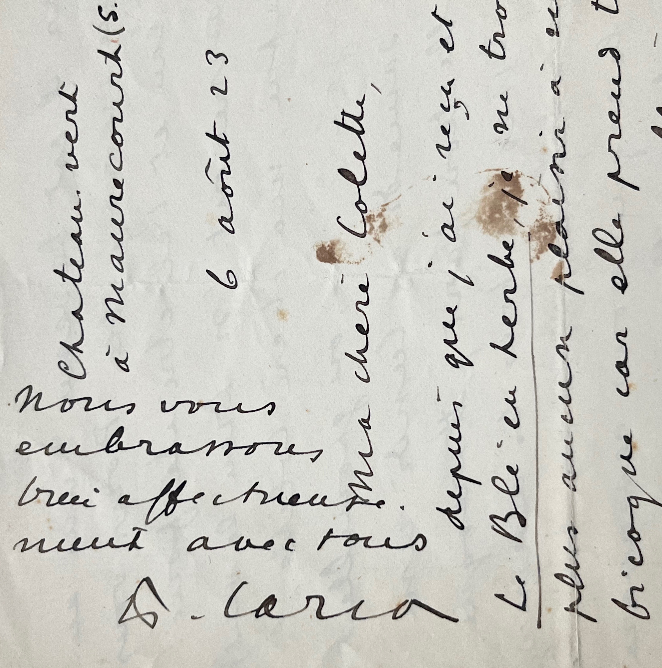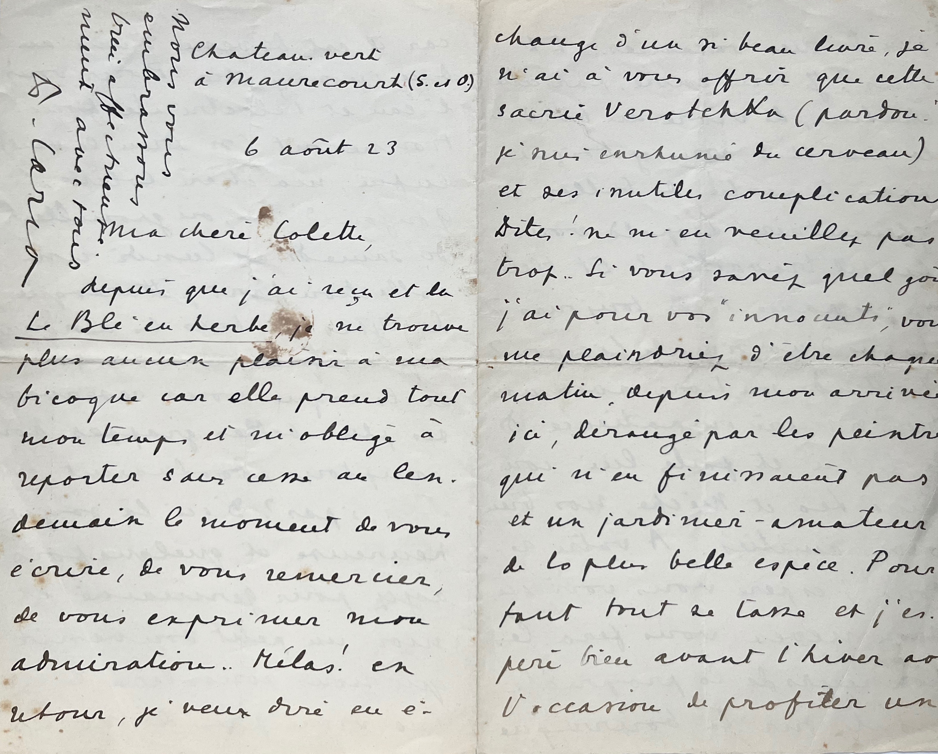 Lettre de Francis Carco à Colette sur Le Blé en herbe et son château de Maurecourt