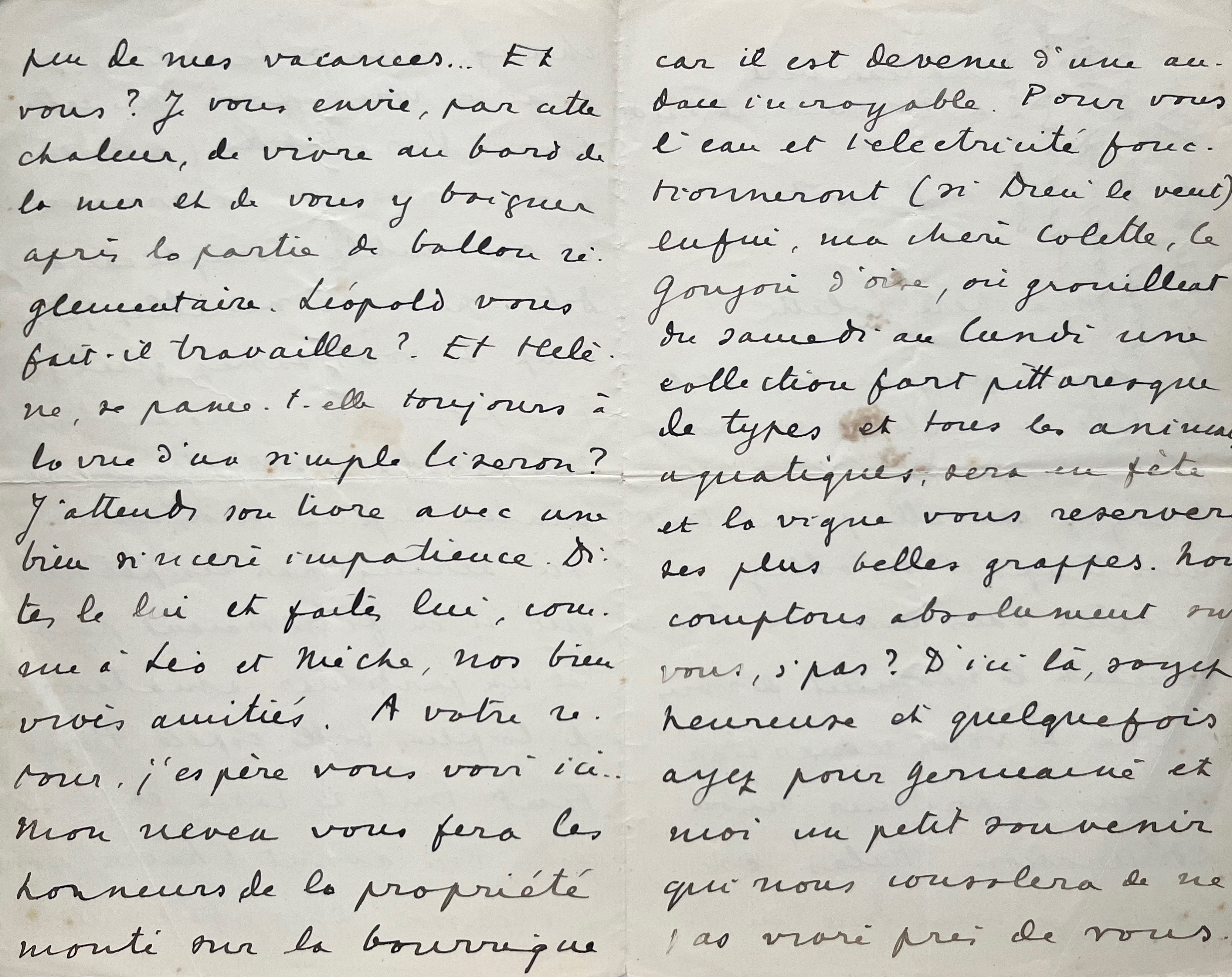 Il s'enquiert de leurs proches "Et vous? Je vous envie, par cette chaleur, de vivre au bord de la mer et de vous y baigner après la partie de ballon réglementaire. Léopold [Marchand] vous fait-il travailler ? Et Hélène, se pâme-t-elle toujours à la vue d'un simple liseron ? J'attends son livre avec une bien sincère impatience [...]".